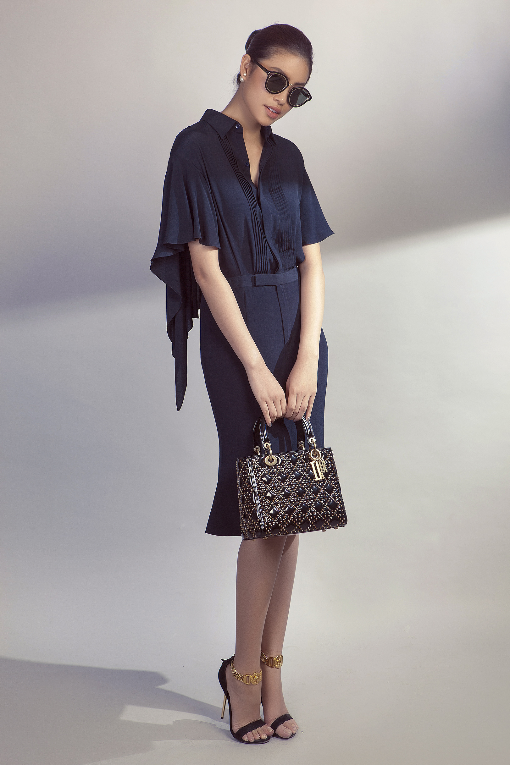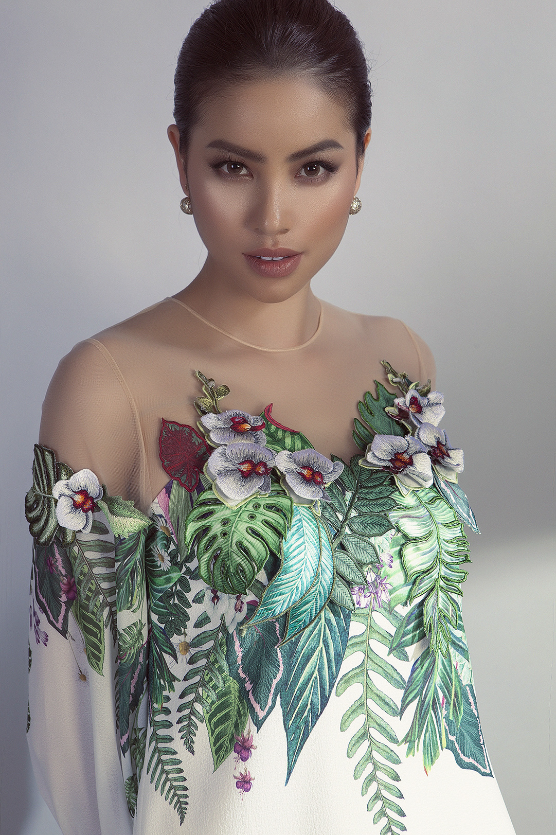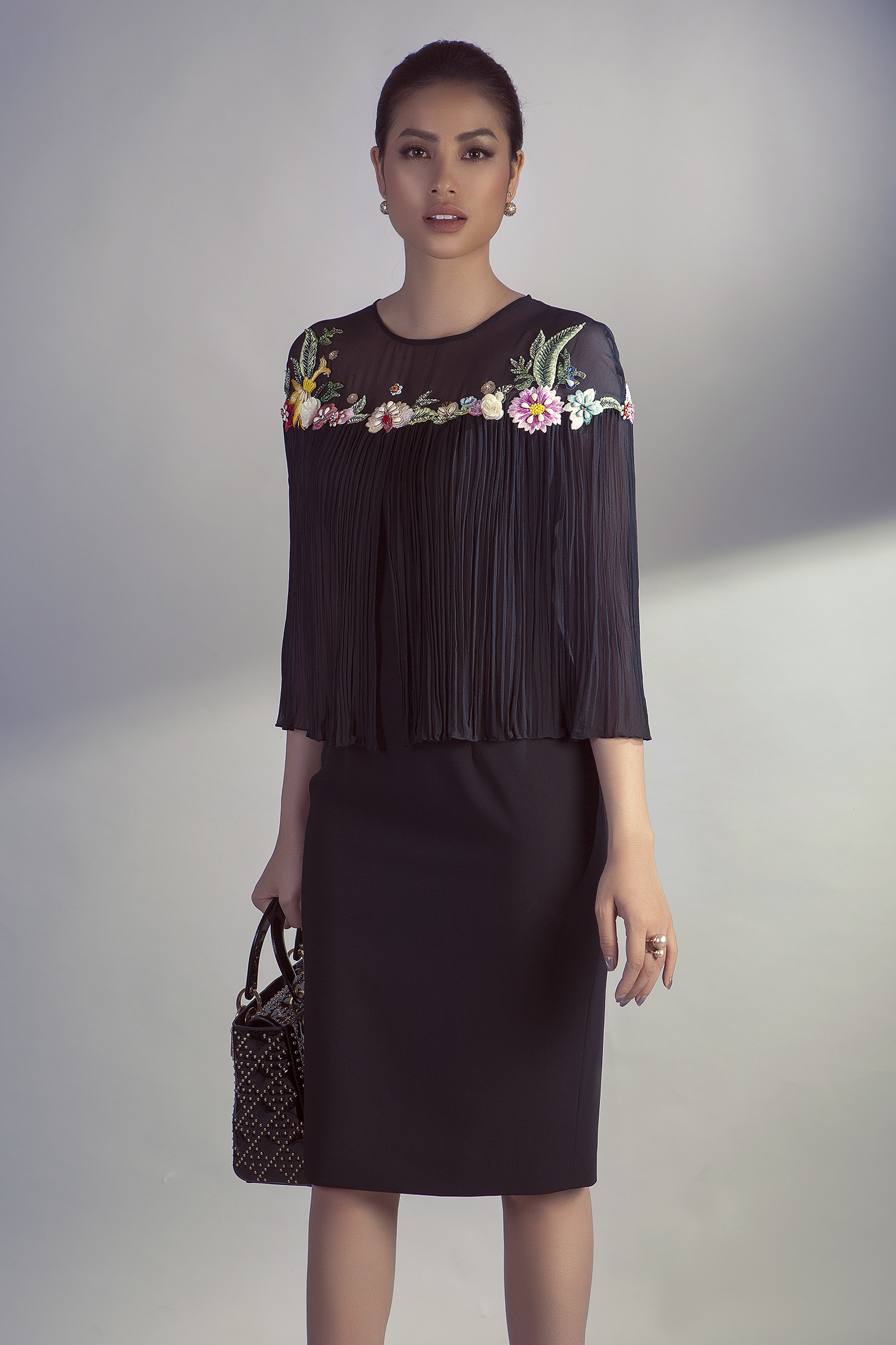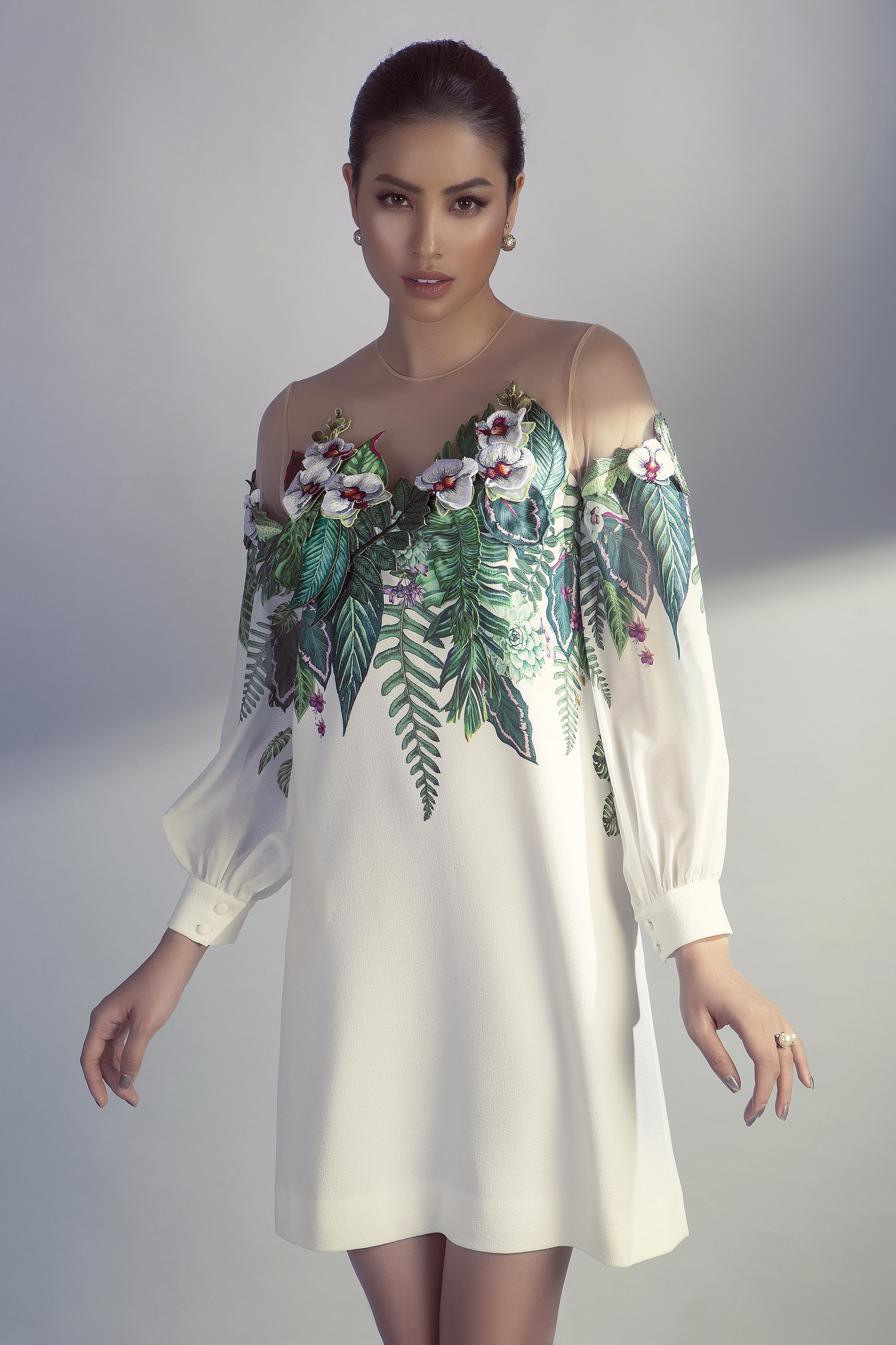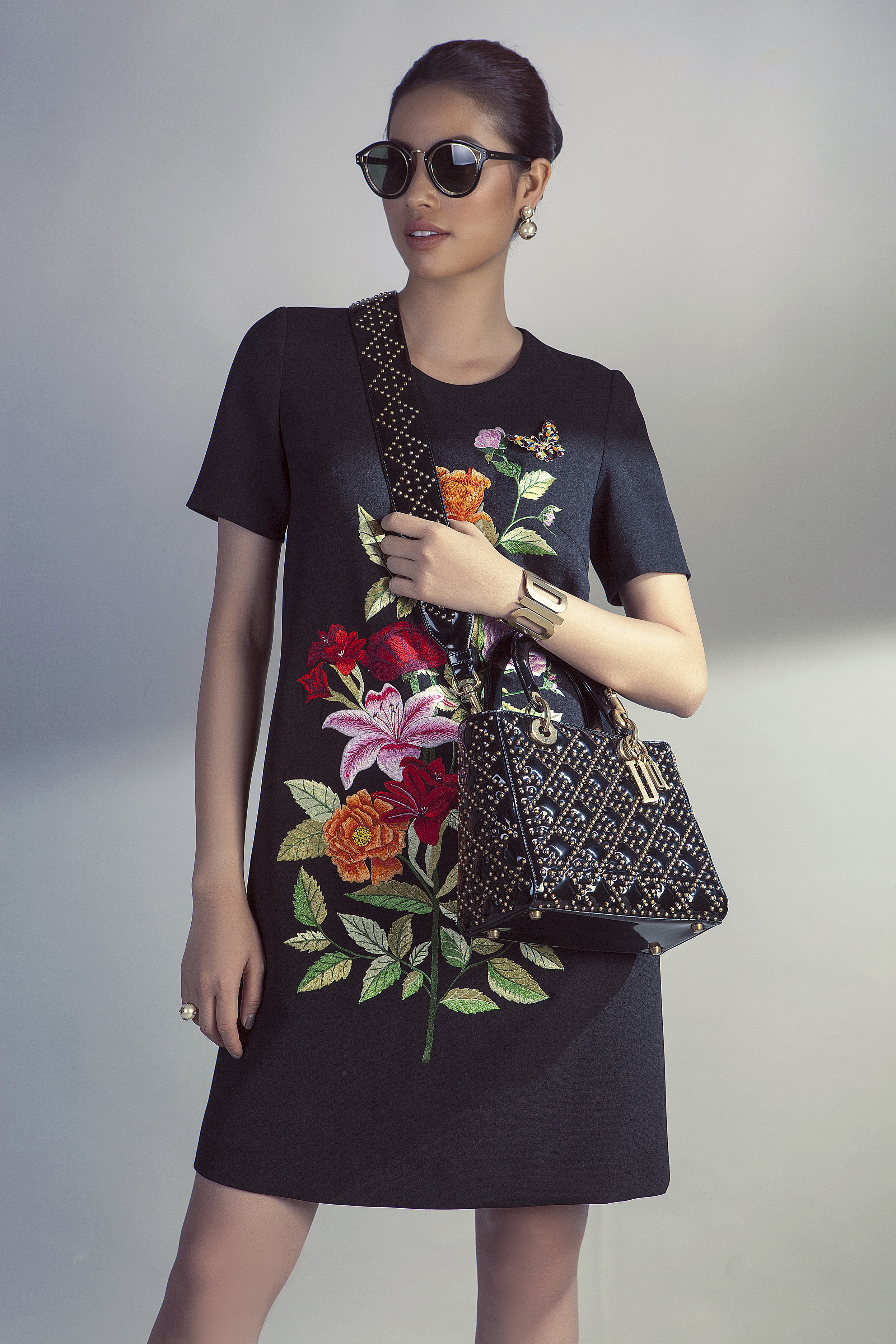 Với thiết kế đầm chữ A bằng chất liệu cao cấp được thêu nổi những bông hoa đa sắc hoàn toàn bằng kỹ thuật thêu thủ công, cựu huấn luyện viên The Face kết hợp thêm kính mát, túi xách đen cùng vòng tay & hoa tai kim loại, mang đến ấn tượng vừa mạnh mẽ hiện đại nhưng vẫn không kém phần duyên dáng & nữ tính cho bộ cánh.