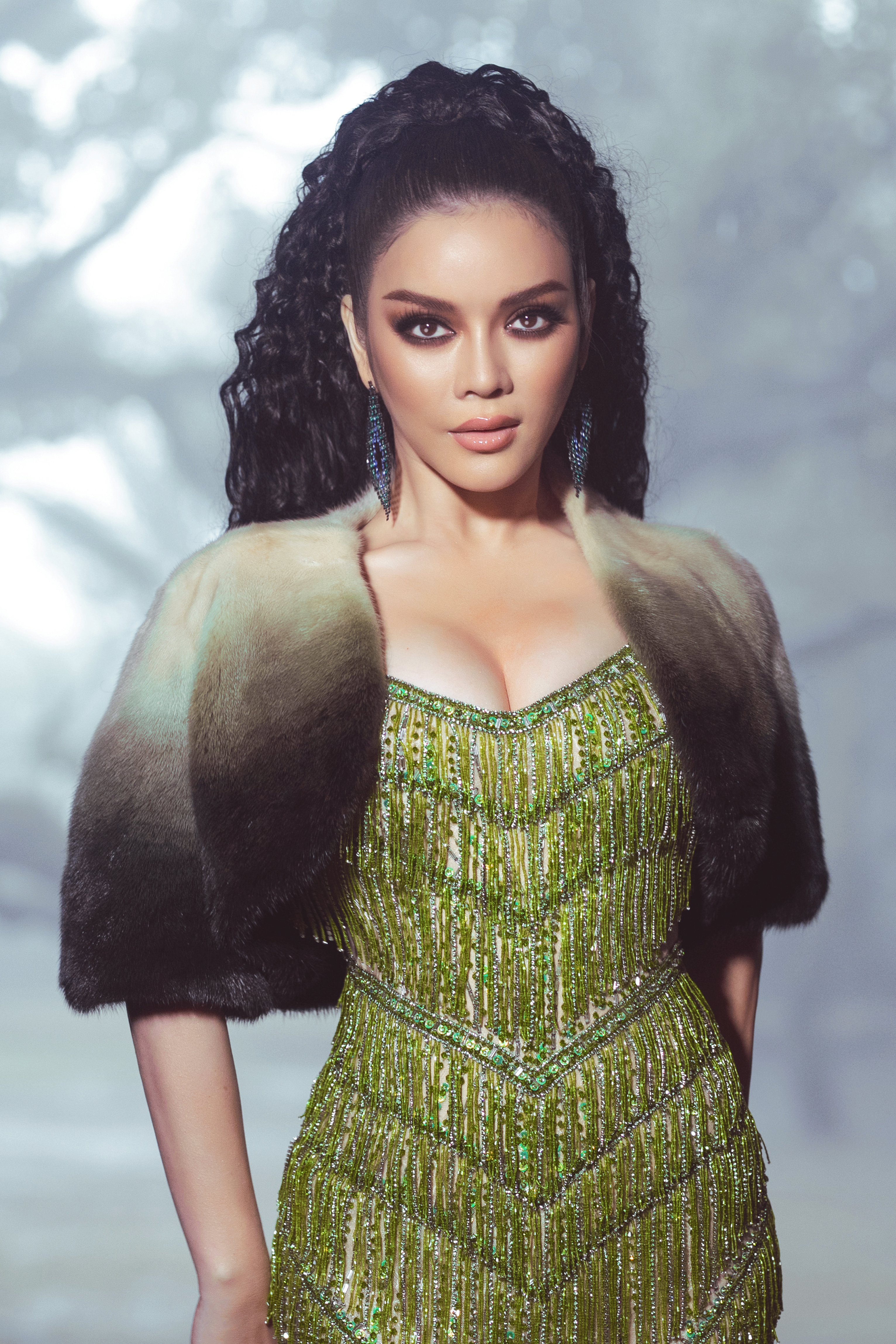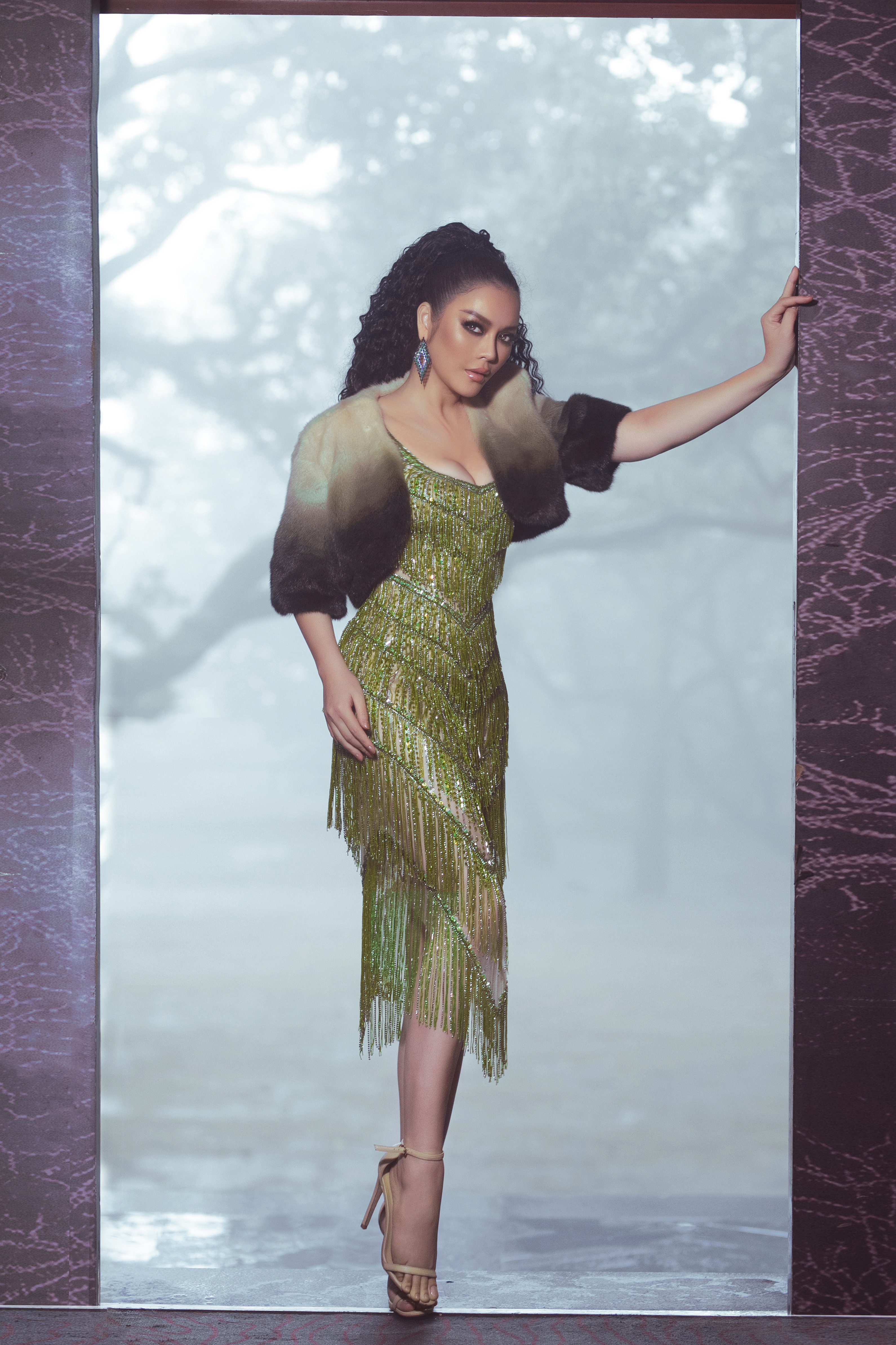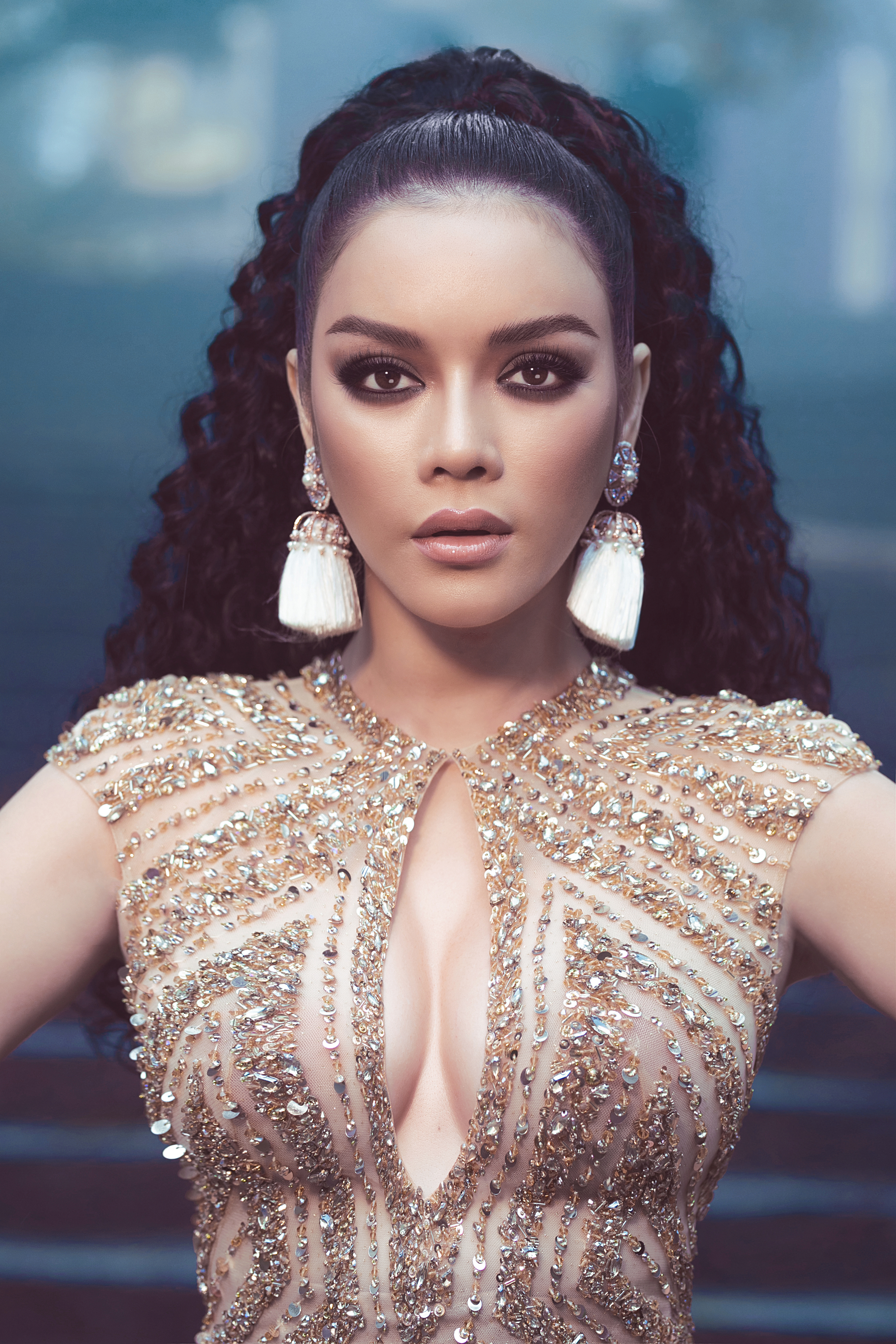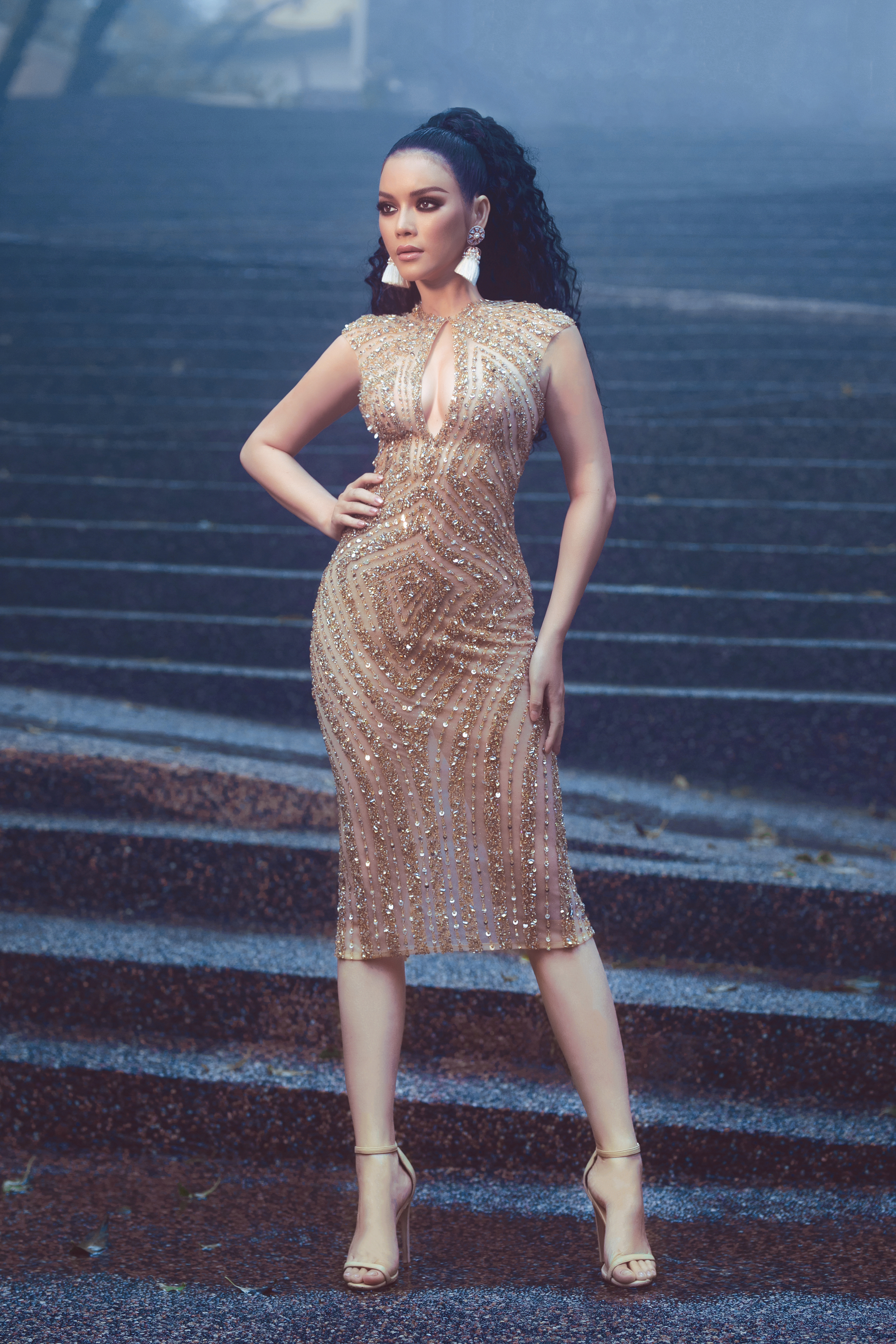 Về trang phục, hai chiếc đầm haute couture nằm trong bộ sưu tập Pre Fall của NTK Đỗ Long với hơi thở hiện đại, sang trọng, thể hiện cá tính phóng khoáng trong đường lối thiết kế vốn đặc trưng ở anh. Với thủ công thêu may tỉ mỉ, đính kết hàng nghìn viên pha lê gần 3 tháng, từng đường cut-out của chiếc đầm vô cùng tinh tế giúp cô khoe trọn được đường cong cơ thể.