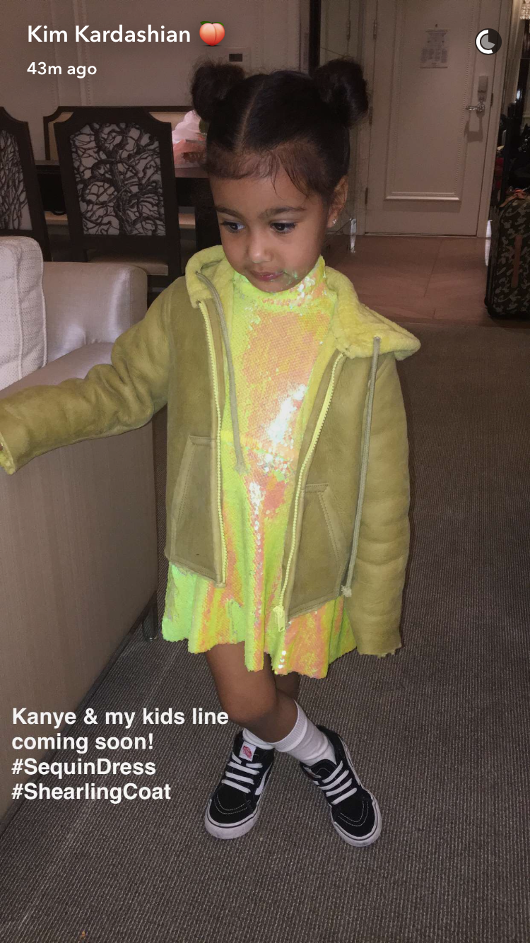 Bức ảnh đăng trên Snapchat của cô Kim với dòng chữ thông báo : Kanye và các bé nhà chúng tôi sắp quay trở lại ! Bé North West - con gái của cô Kim ra dáng một fashionista nhí khi mặc áo khoác lông cừu của Yeezy cùng chiếc váy kim sa lấp lánh, mix với giày Vans mini.
