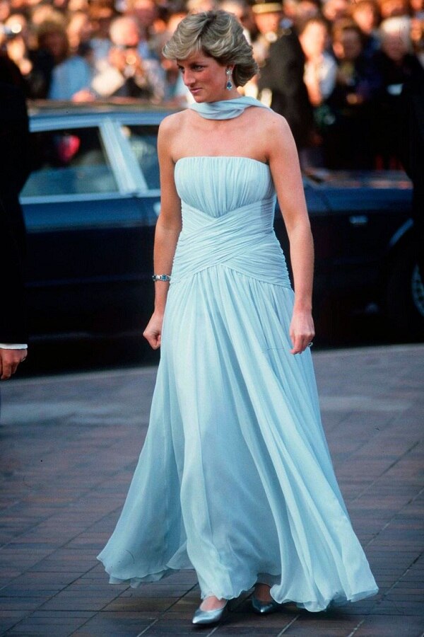 Cố Công nương Diana đã tạo nên dấu ấn lịch sử khi diện chiếc váy xanh nhẹ nhàng, khoe khéo bờ vai thanh mảnh gợi cảm cùng Thái tử Charles xuất hiện trên thảm đỏ LHP Cannes 1987