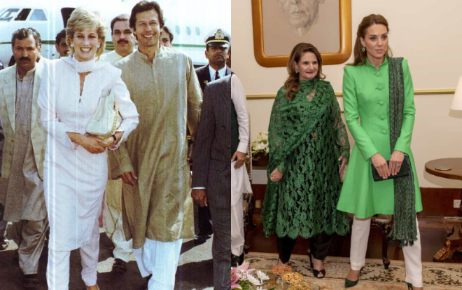 Trùng hợp thay, Công nương Diana đến thăm Pakistan vào năm 1996, bà mặc một chiếc váy đến từ nhà mốt Catherine Walker với phom dáng hao hao bộ váy mà Kate mặc vừa qua