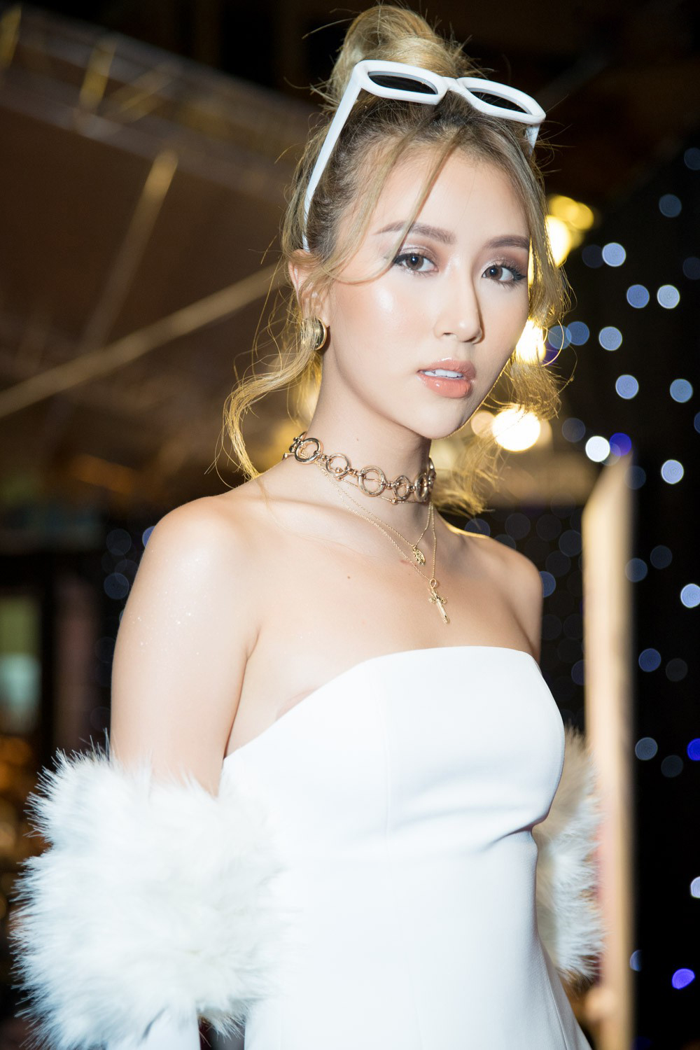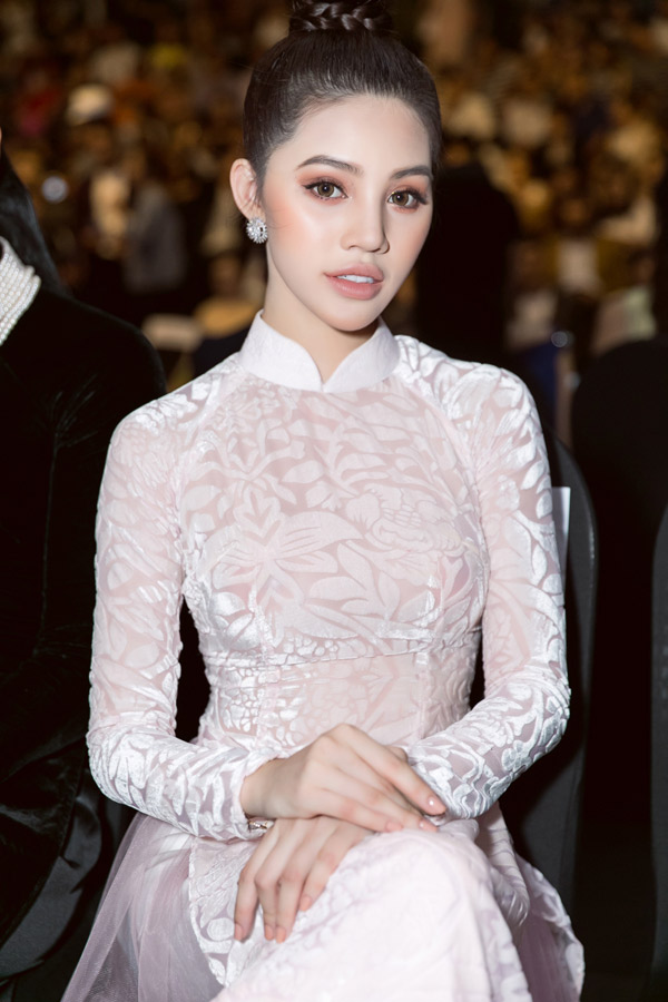 Jolie Nguyễn diện áo dài trắng và trang điểm xinh đẹp như một nàng búp bê kiêu kỳ. Dù chọn tông màu cam đất cho má và mắt, Jolie Nguyễn vẫn trung thành với son màu nude giúp đôi môi căng mọng, quyến rũ.