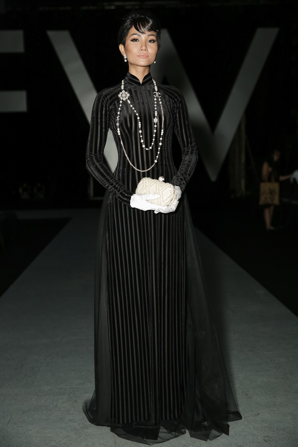 Xuất hiện giữa dàn người đẹp váy áo lộng lẫy trong dòng sự kiện Vietnam International Fashion Week, H'Hen Niê diện áo dài đen tưởng đơn giản mà lại hóa nổi bật nhất. Ngay cả lối trang điểm của hoa hậu cũng phù hợp và đẹp không chê được điểm nào. Có lẽ tất cả những ai còn nghi ngờ về nhan sắc của H'Hen Niê sẽ phải “câm nín” khi thấy cô trong diện mạo này.