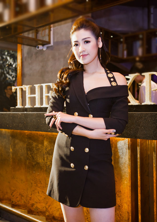 Lựa chọn mẫu váy lấy ý tưởng từ vest cách điệu của NTK Kim Khanh phối cùng các chi tiết nút đồng cá tính. Á hậu 1 Hoa hậu Việt Nam 2012 chọn thêm phụ kiện hoa tai bản to để nêu bật cá tính.