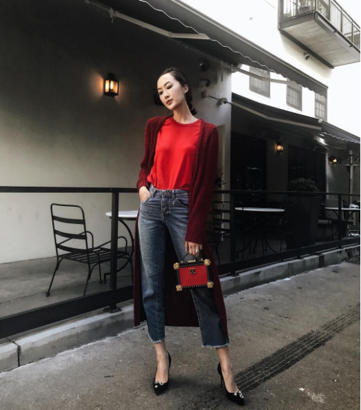 Combo2: Hoặc các nàng cảm thấy ngại ngùng khi diện áo khoác họa tiết da động vật thì cardigan dáng dài cũng là một gợi ý hay ho từ cô nàng Chriselle Lim.