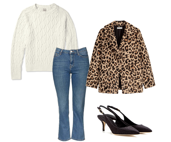 Combo1: Nếu các nàng không biết mặc gì trong những ngày đầu năm lạnh buốt thì áo sweater phối kết cùng quần jeans cắt gấu và chiếc áo jacket da báo cũng sẽ giúp bạn nổi bật khi xuất hiện đấy!