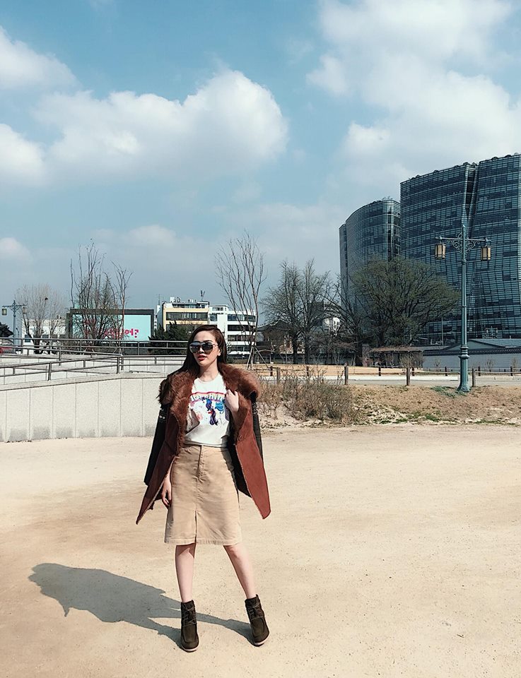 Khi diện áo thun Moschino có hình Pony ngộ nghĩnh, Bảo Thy vẫn không quên kết hợp với áo khoác dạ cổ lông cho đúng với phong cách thường ngày.