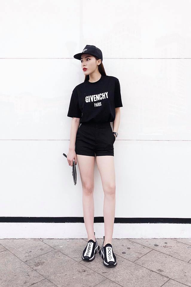 Duyên thường lên đồ với áo thun rất đơn giản nhưng tập trung nhiều vào phụ kiện. Đôi sneaker Dolce&Gabbana cũng mới được Duyên tậu về.