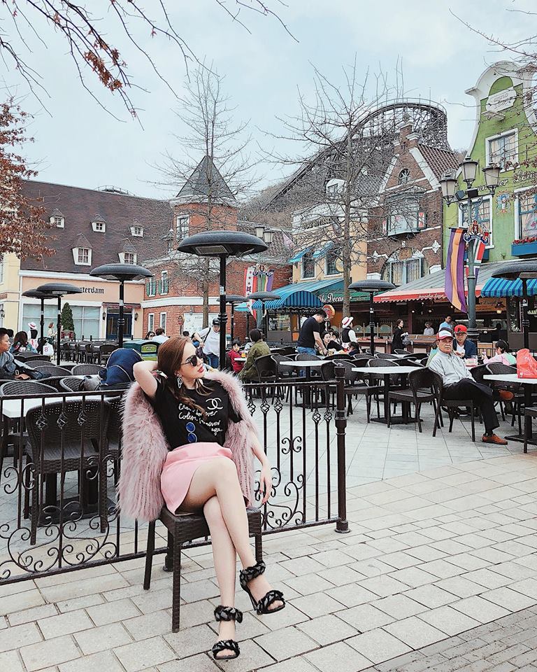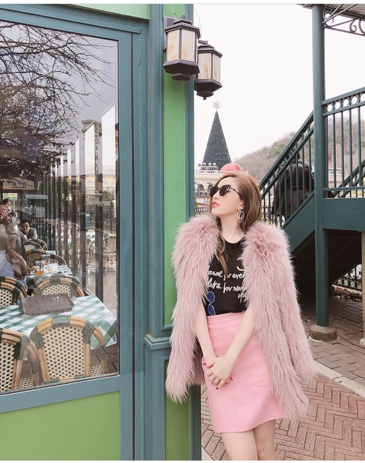 Diện áo thun đen của Chanel, Bảo Thy kết hợp với áo khoác lông màu hồng và chân váy cũng màu hồng cùng đôi sandal đan dây lạ mắt.