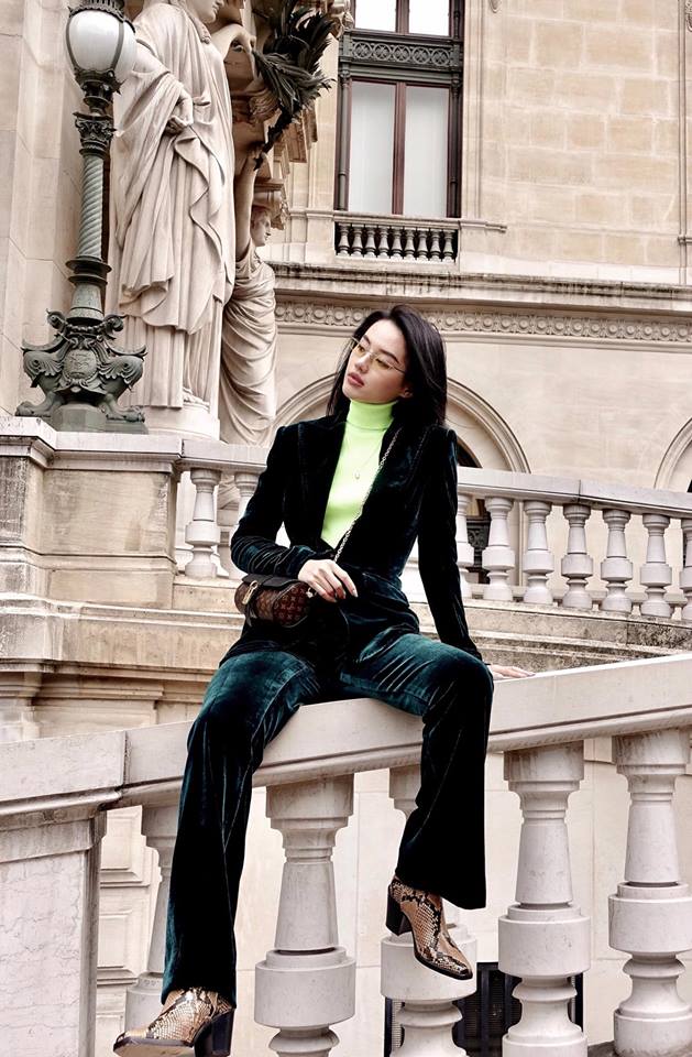 Gương mặt thương hiệu Khánh Linh không hề kém cạnh cũng chọn cho mình set áo blazer và quần nhung xanh sẫm ngọc bích tạo nên phong cách tinh tế khi phối các item cùng tông màu nhưng mang sắc độ đậm nhạt khác nhau. Thế nhưng, cô nàng lại biết kết hợp thêm phụ kiện như kính râm, túi xách LV và boots da rắn sành điệu