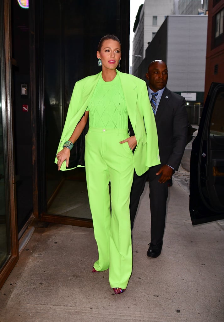 Nữ diễn viên đình đám kiêm fashion icon Blake Lively là một trong những người đep lăng xê mốt này đầu tiên khi cô diện một bộ suit xanh neon chói lóa bên ngoài cùng với chiếc áo len cùng tông màu bên trong, tỏa sáng rực rỡ trên phố thu hút bao ánh nhìn