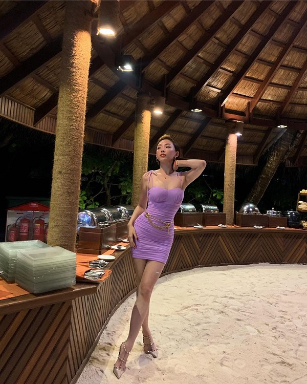 Ngọc Trinh trong ngày sinh nhật của mình cũng từng diện kiểu váy tím hai dây có thiết kế hao hao giống hai mỹ nhân trên khoe được body cực phẩm của cô nàng.