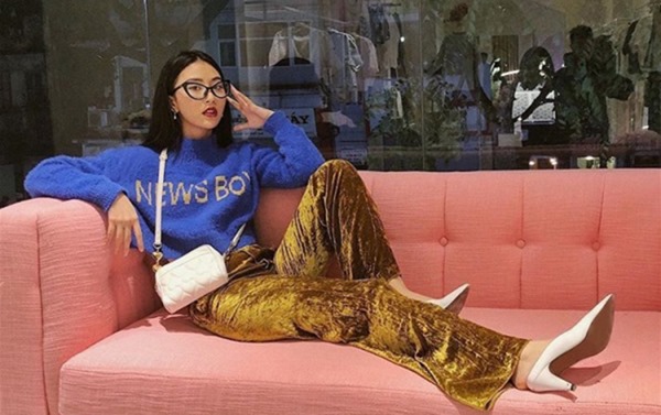 Fashionista Quỳnh Anh Shyn rất khéo léo khi kết hợp quần nhung màu vàng mustard kết hợp với áo len xanh dương tạo nên gam màu tươi mới, trẻ trung