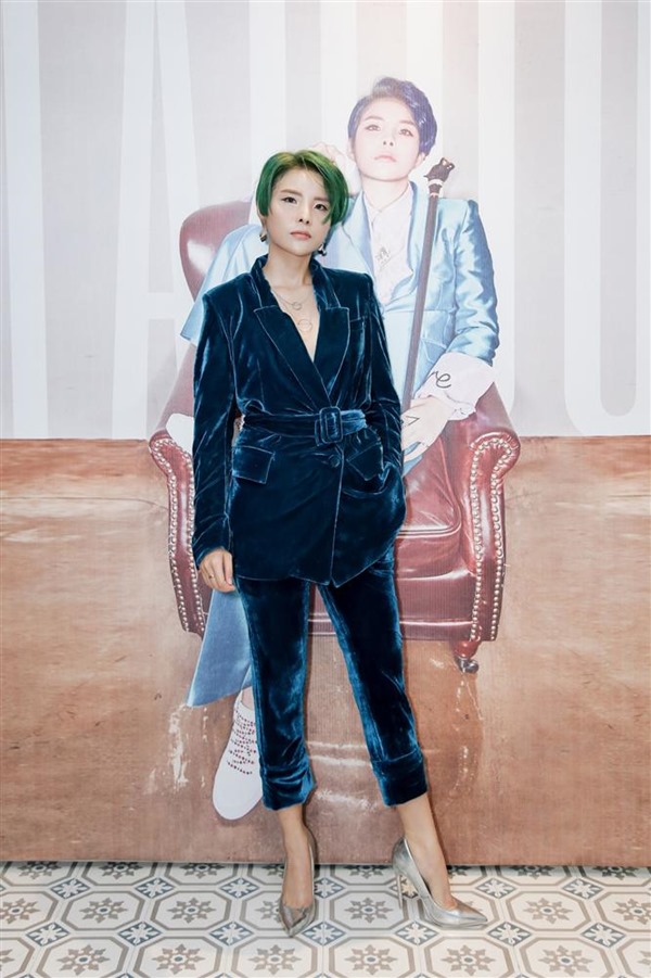 Vũ Cát Tường với diện mạo mới nữ tính khi mặc nguyên cả bộ vest nhung màu xanh dương theo mốt không nội y và đi giày cao gót điệu đà.