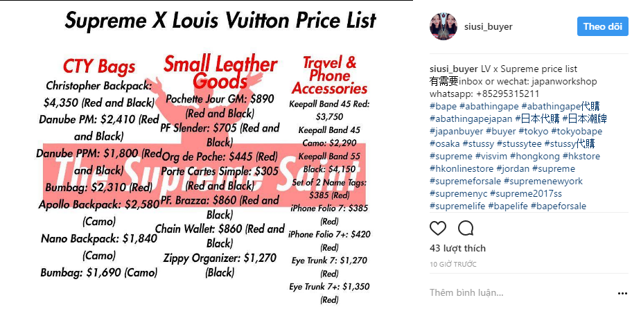 Được biết, giá thành trên từng sản phẩm dao động trong khoảng 200 USD (khoảng 5 triệu đồng) cho đến 7000 USD (khoảng 160 triệu đồng). Có tới 65 mẫu thiết kế với nhiều loại khác nhau, mang tính ứng dụng cao và rất trendy. Sự đặc biệt của bộ sưu tập lần này vẫn đẩy mạnh họa tiết logo của 2 brand một cách xen kẽ và in trên nhiều loại chất liệu khác nhau. Đặc biệt hơn khi áp dụng cả lên những mẫu áo khoác có thể mặc 2 mặt, mang tới lựa chọn thú vị cho các “thượng đế”. Chưa dừng ở đó, ngoài bán quần áo thì Louis Vuitton x Supreme còn bán rất nhiều các món đồ phụ kiện khác như mũ lưỡi trai, móc khóa, balo…