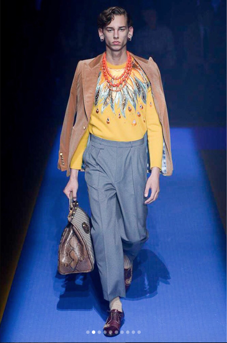 Bên cạnh hoạ tiết kẻ sọc, những chi tiết thêu đính cầu kỳ cũng được áp dụng trên nhiều thiết kế trong BST Xuân-Hè 2018, kể cả những item giành cho nam cũng có nhiều cho tiết đính sequin cầu kỳ.