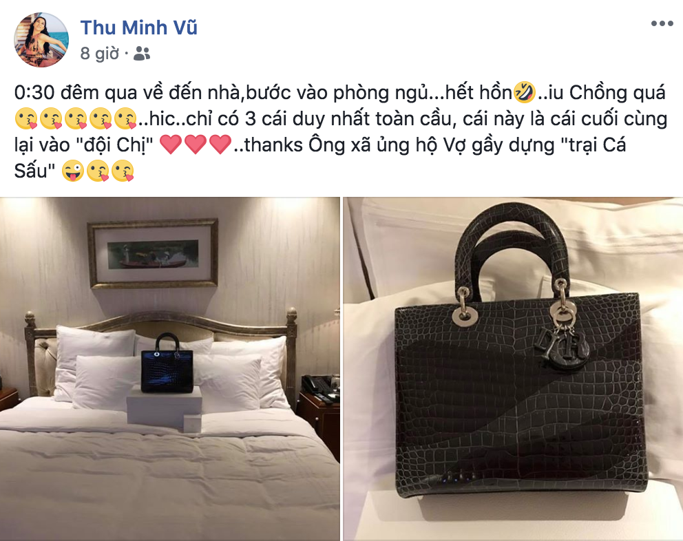 Được biết, đây không phải là lần đầu tiên nữ nghệ sõ sở hữu chiếc túi hiệu bằng chất liệu da cá sấu. Trước khi được ông xã yêu thương tặng túi Dior, Thu Minh từng khiến khán giả “choáng ngợp” với mẫu Hermes Berkin trị giá 1,5 tỷ đồng.