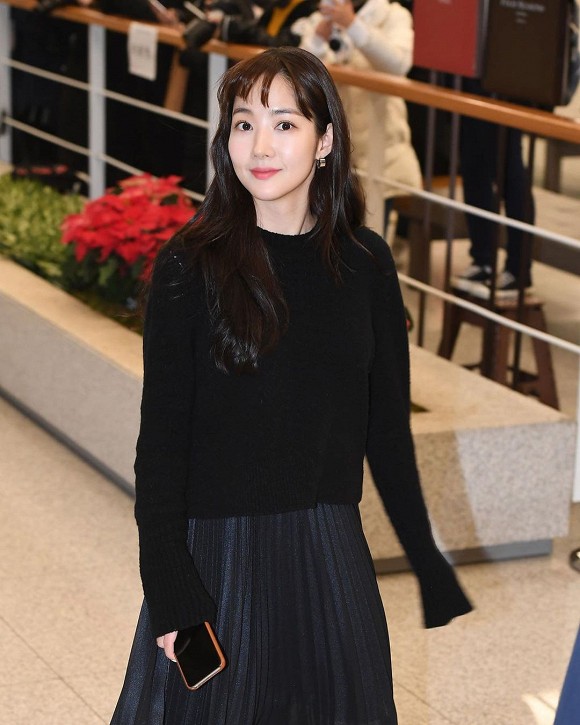 Không kém cạnh chị em đồng nghiệp, Park Min Young tươi tắn trong set đồ áo len dài tay kết hợp chân váy xếp ly tông đen có chất liệu xuyên thấu