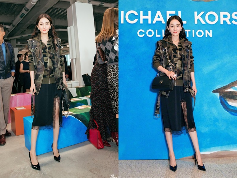 Trong show ra mắt BST Xuân Hè 2019 của Michael Kors còn có sự góp mặt của diễn viên Dương Mịch. Người đẹp chọn phong cách layers họa tiết camo cho phần áo và chân váy phối ren, xẻ tà hết sức gợi cảm.