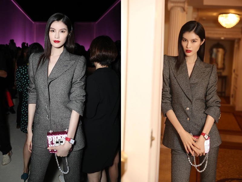 Thiên thần Sui He của Victoria’s Secret tham dự show diễn của Tom Ford với phong cách suit màu xám đậm chất menswear cá tính, mạnh mẽ.