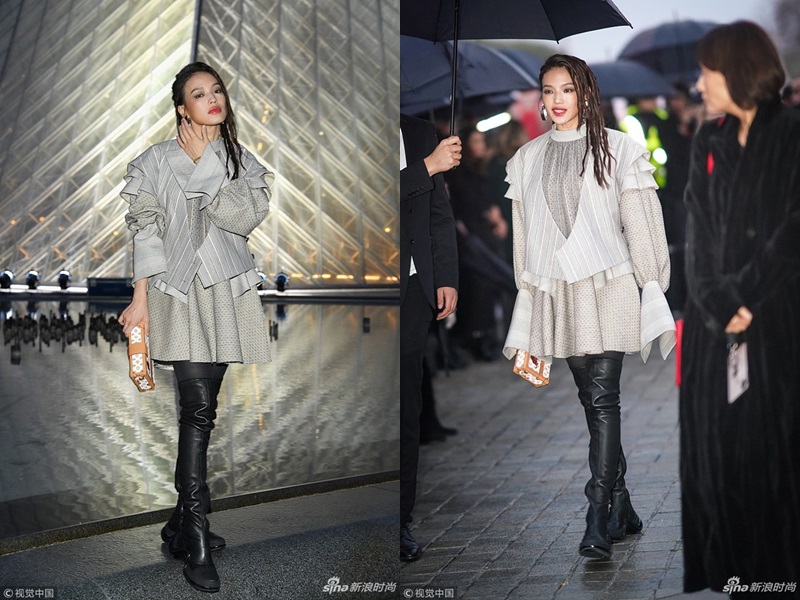 Không quyến rũ hay nữ tính như thường lệ, Thư Kỳ tham gia show Louis Vuitton với phong cách thời trang cá tính hầm hố với mái tóc style “dây thừng Châu Phi”