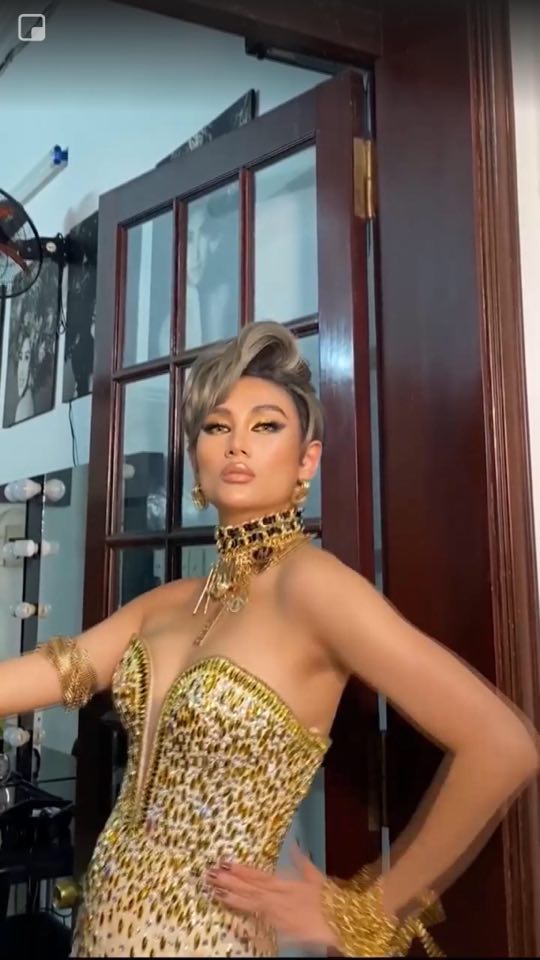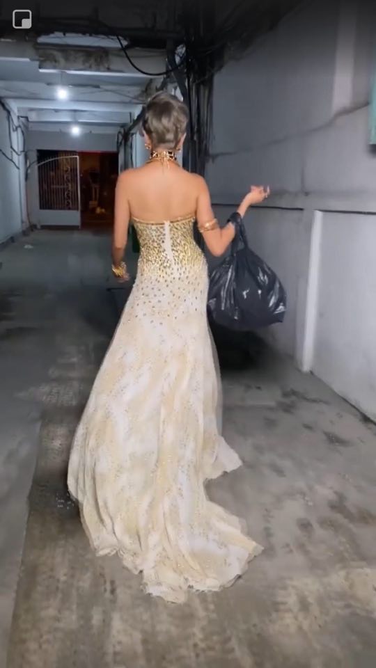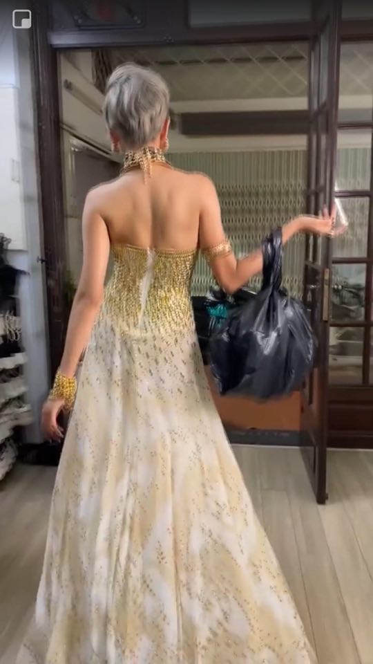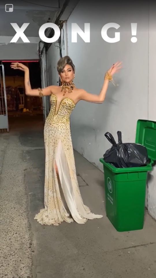 Mặc một chiếc váy dạ hội lồng lộn của 11 năm trước, Võ Hoàng Yến khiến fan cười rụng răng khi tạo dáng từ trong nhà ra tới ngoài ngõ chỉ để đi quăng một bịch rác. Được biết, chiếc váy từng được cựu Á hậu 1 - Hoa hậu Hoàn vũ Việt Nam diện ở kỳ Miss Universe 2009.