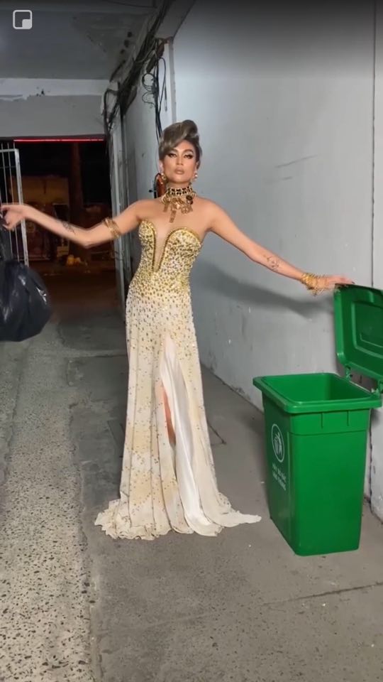 Trước Võ Hoàng Yến, một cái tên khác cũng từng có hành động khó đỡ tương tự. Đó là cựu Hoa hậu Hoàn vũ Colombia 2016 - Á hậu 1 Miss Universe 2017 - Laura Barjum. Cô cũng makeup lồng lộn và mặc lại chiếc váy từng diện trên sân khấu Miss Universe để đi đổ rác.