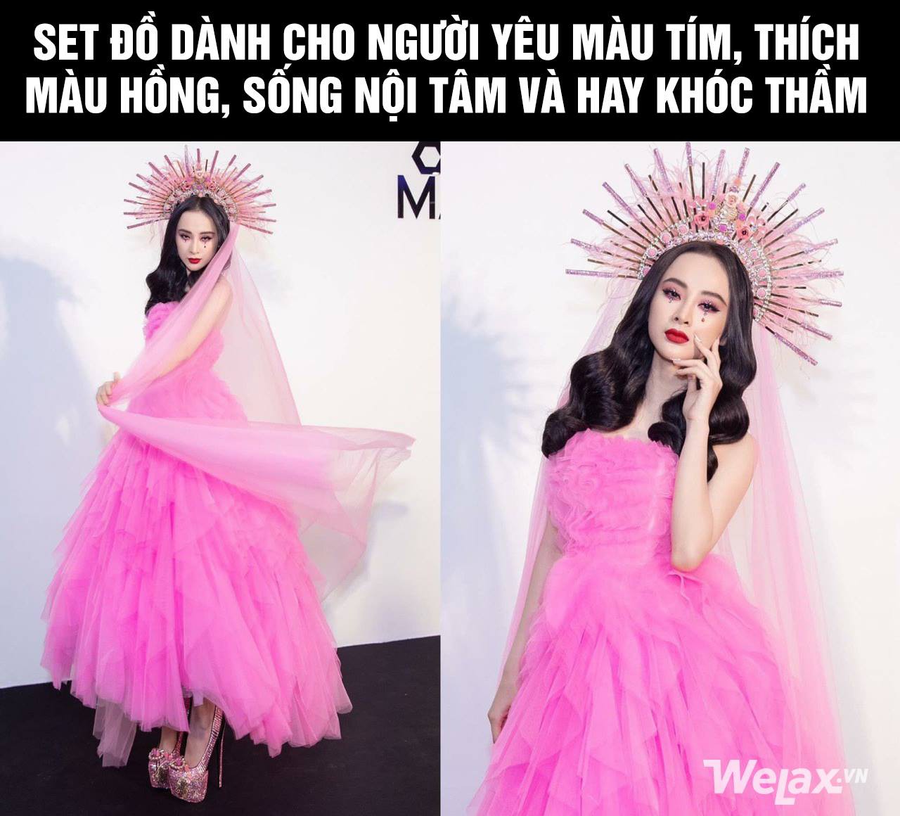 Áo váy hồng dịu dàng, voan đội cùng vòng hào quang đội đầu tỏa sáng… Bấy nhiêu đó vẫn chưa đủ, vì nếu thiếu lối trang điểm ấn tượng với giọt nước mắt đậm chất tôn giáo, vẻ ngoài của Angela Phương Trinh sẽ chẳng đẹp và lạ đến thế.