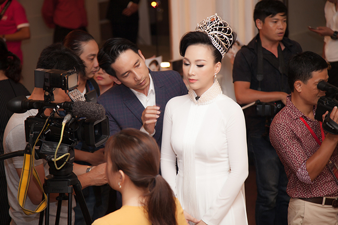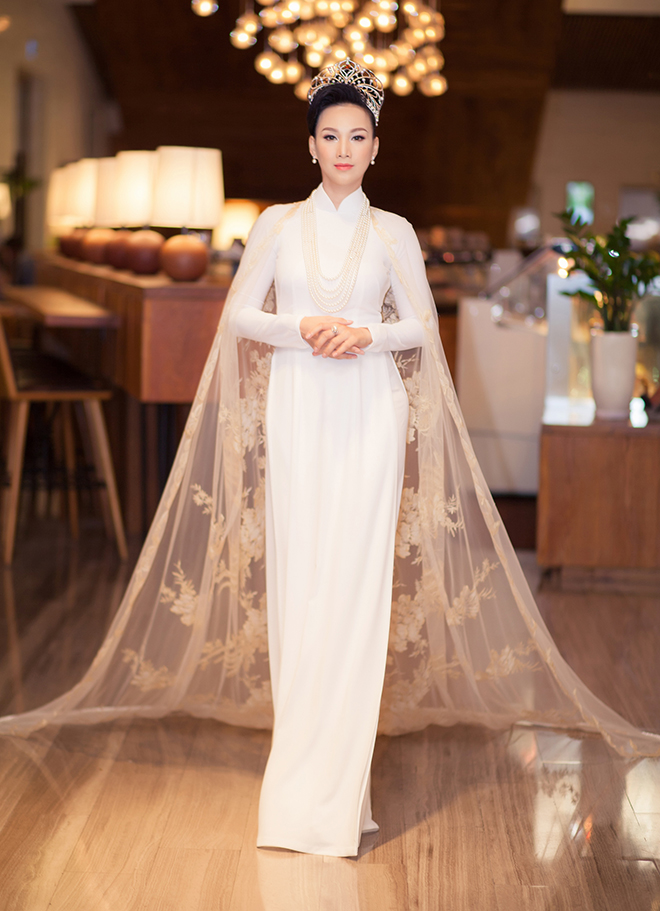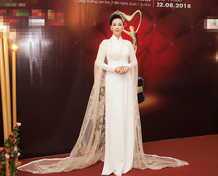 Tối 22/8, cựu người mẫu - hoa hậu Paris Vũ tham dự sự kiện tại TP.HCM. Paris Vũ xuất hiện ấn tượng trong bộ áo dài được thiết kế kỳ công bởi nhà tạo mốt Nhật Dũng. Đi kèm áo dài truyền thống, hoa hậu chọn bộ trang sức ngọc trai trị giá hơn 200 triệu đồng, vương miện trị giá tiền tỷ.
