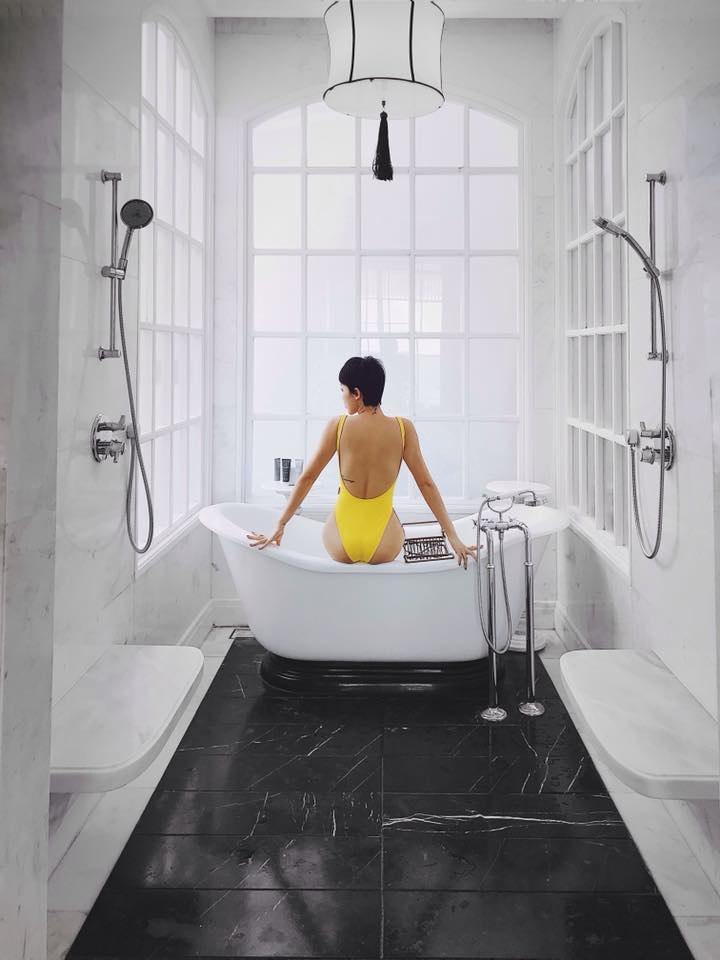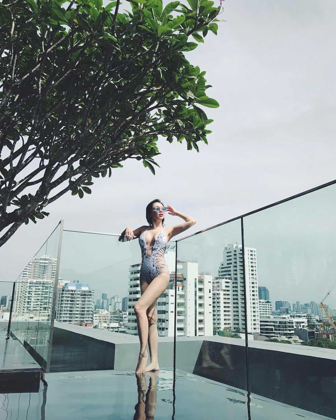 Và monokini - những bộ áo tắm liền mảnh là một trong những items yêu thích của Tiên. Cô không chỉ diện nó khi ra biển mà còn sử dụng cả trong street style bởi với thiết kế ấy, Tiên khoe trọn vẹn được những gì đẹp nhất của cơ thể: đôi chân dài, eo thon và vòng 3 cao tròn, săn chắc.