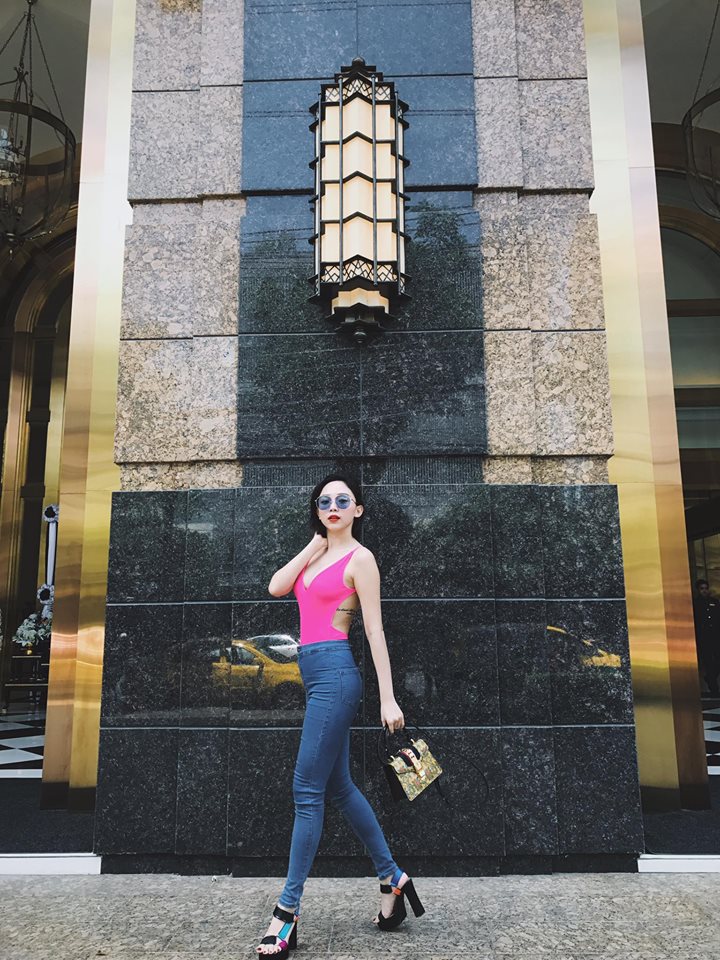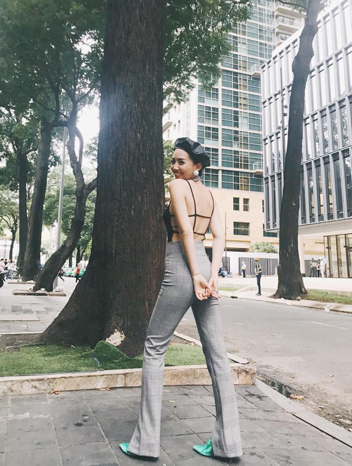 Vóc dáng thon thả và số đo ba vòng chuẩn giúp Tiên tự tin hơn rất nhiều khi khoác lên người những bộ đồ cực hở thế này.