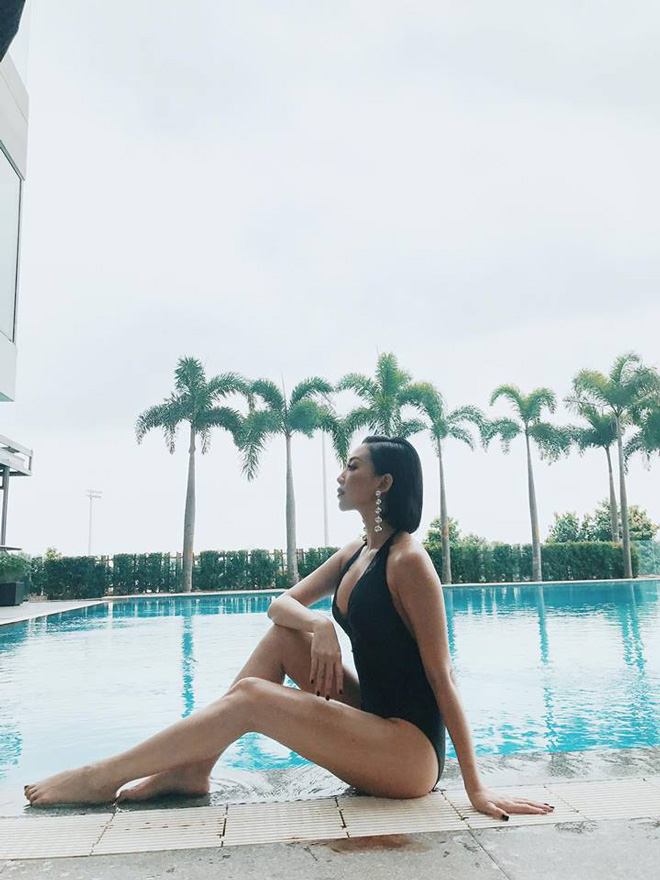 Tiên tạo dáng đẹp chất ngất bên hồ bơi với bộ monokini đen.
