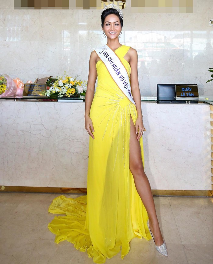 Có thể thấy, thiết kế này có kết cấu tương tự như chiếc váy vàng từng giúp H'Hen Niê làm nên lịch sử. cả hai cùng trùng khớp những chi tiết cắt cúp khoe eo, khoe chân thon dài, tôn lên dáng vóc người mặc.