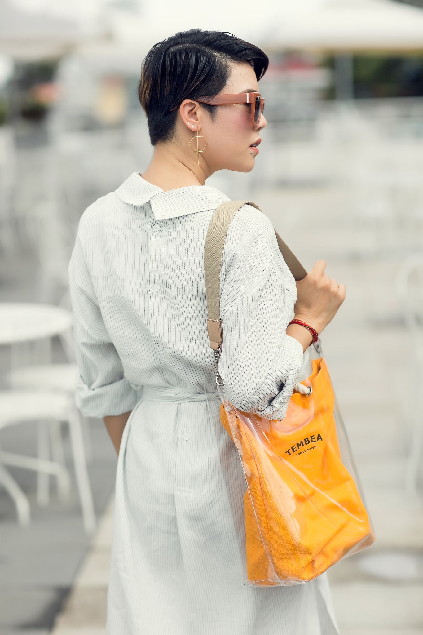 Cô kết hợp thêm phụ kiện túi trong suốt hot nhất hè này cùng mắt kính to bản khiến set đồ thêm phần thu hút.