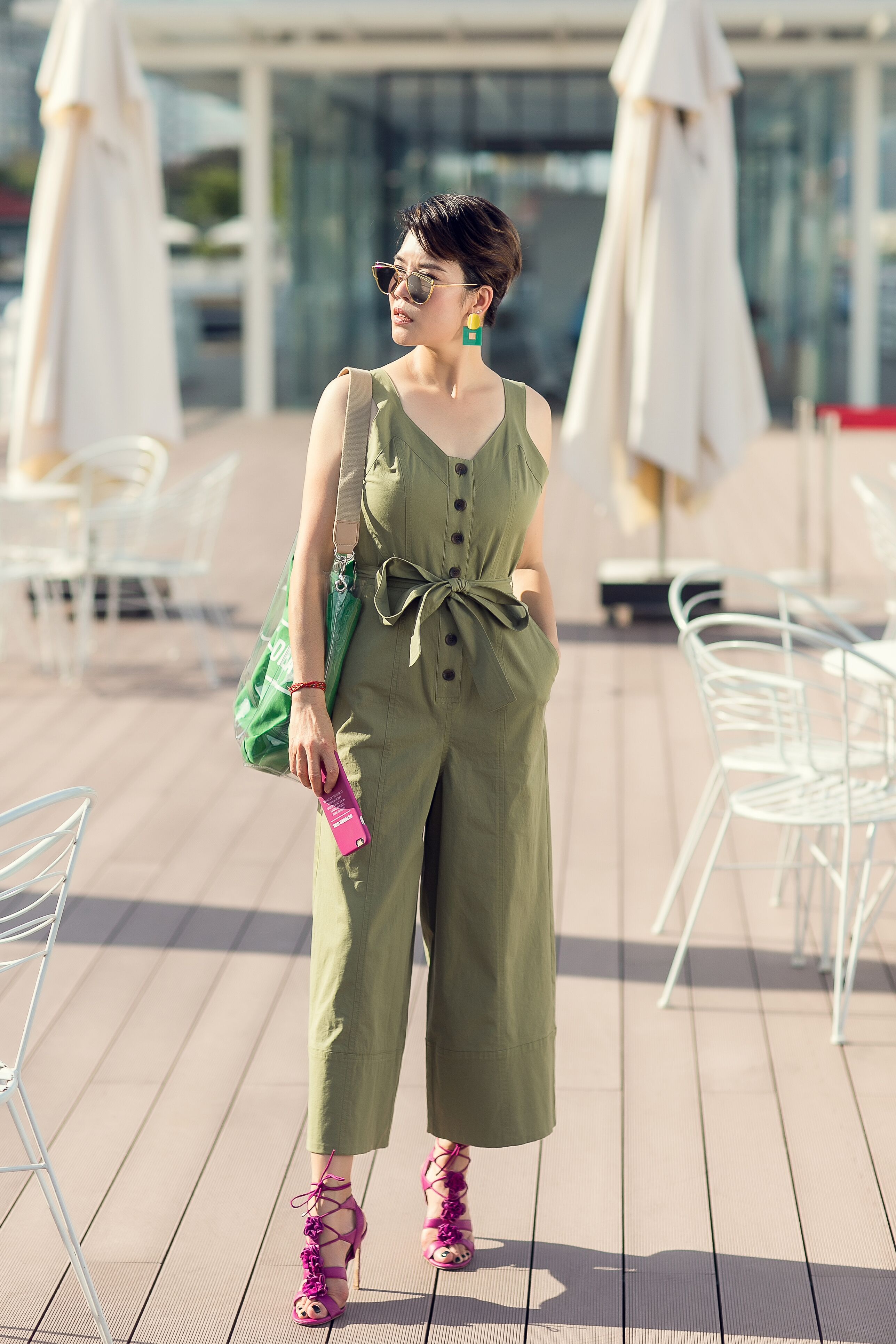 Bộ jumsuite màu xanh bơ với phần eo được thắt nơ giúp Thu Phương trông vừa trẻ trung vừa năng động. Chị đại The Voice còn cao tay trong việc chơi màu sắc, khi phối cùng 1 đôi sandals cao gót màu nóng để nhấn nhá giúp set đồ thú vị hơn.
