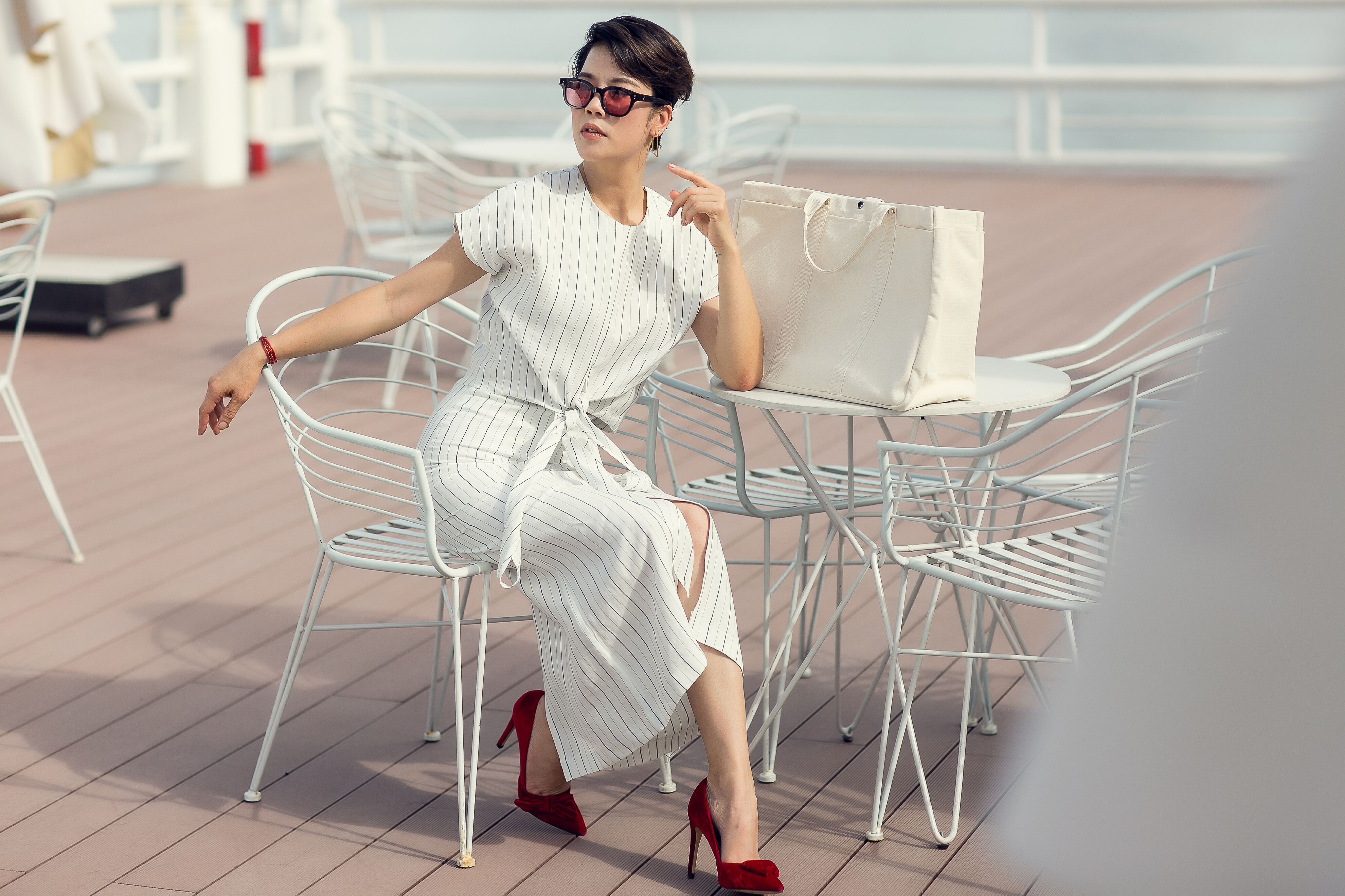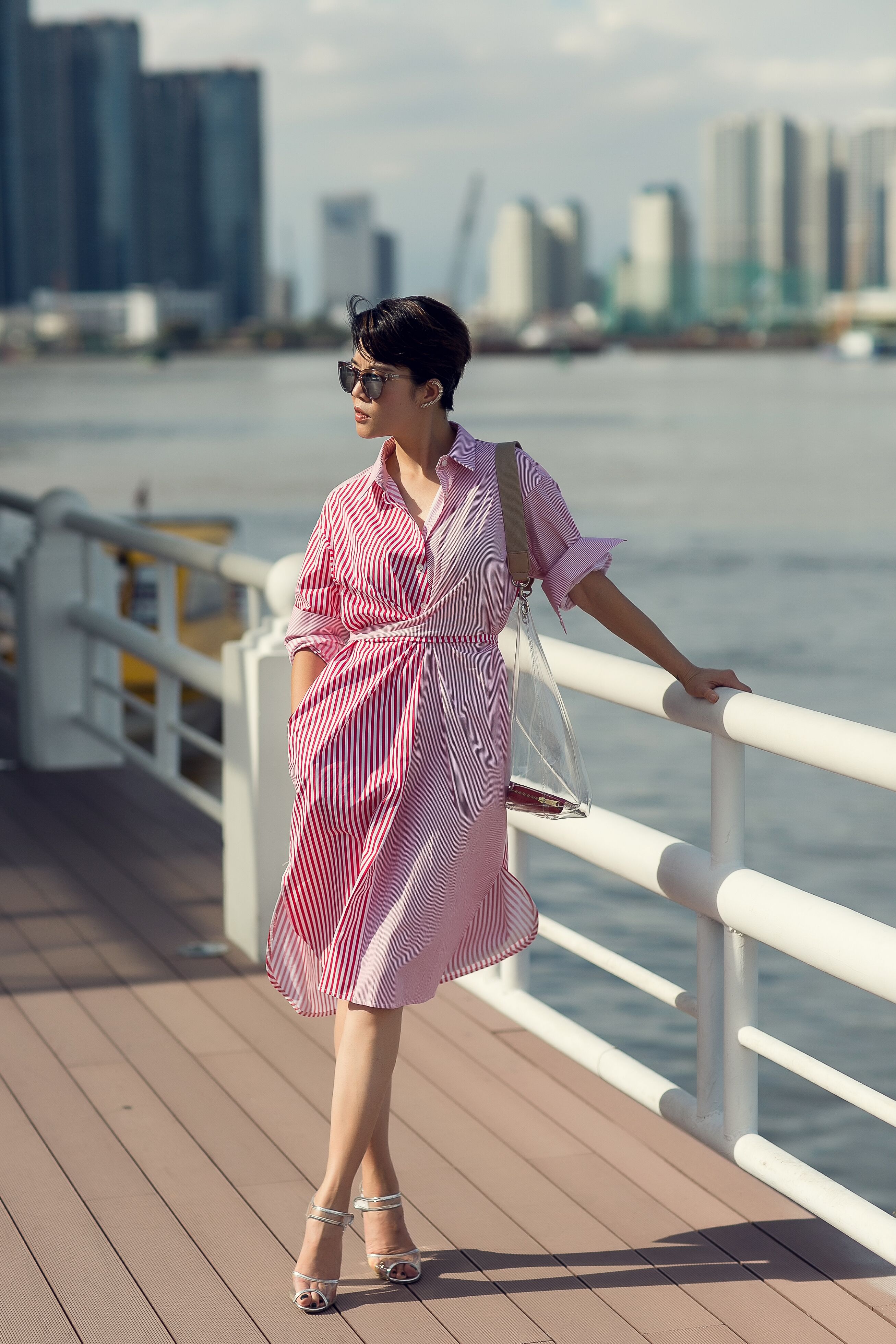 Chiếc váy sơ mi dọc trắng đỏ với phần eo xoắn độc lạ được Thu Phương kết hợp cùng sandals và túi trong suốt mới thời thượng làm sao.