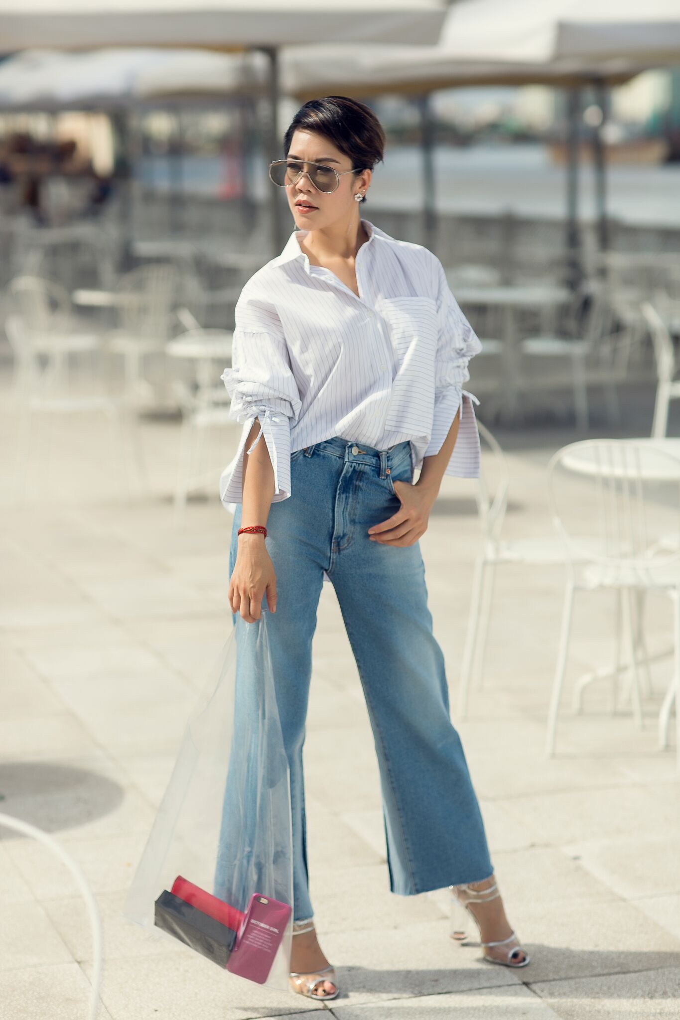 Dù set đồ được phối với những items cơ bản ai cũng có nhưng bằng cách nhấn nhá các phụ kiện đi kèm như túi trong suốt, kính mát dáng phi công, Thu Phương vẫn thu hút đến lạ kỳ.