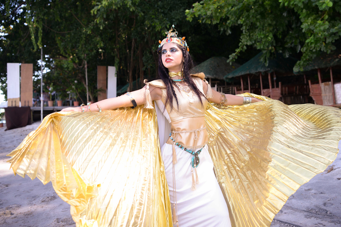 Quốc phục được lấy cảm hứng từ những vị thần chính là ý tưởng của đại diện Ai Cập. Cô còn đầu tư make up, làm tóc để có hình tượng hoàn hảo nhất.