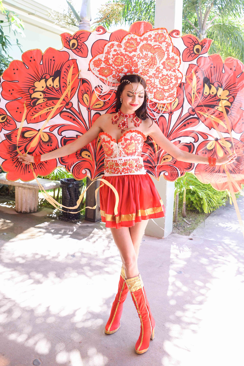 Hoa hậu Nga lại lựa chọn bộ quốc phục mang gam màu đỏ rực rỡ với những họa tiết, hoa văn trang trí cách điệu từ những biểu tượng truyền thống.