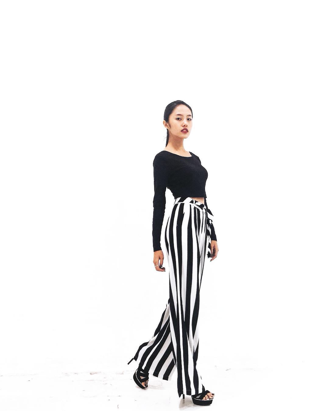 Thanh Vy chọn cho mình chiếc quần sọc đen trắng dài lưng cao với áo crop top đen dài tay .Cô là tín đồ của gam màu cơ bản như trắng - đen hay trung tính.