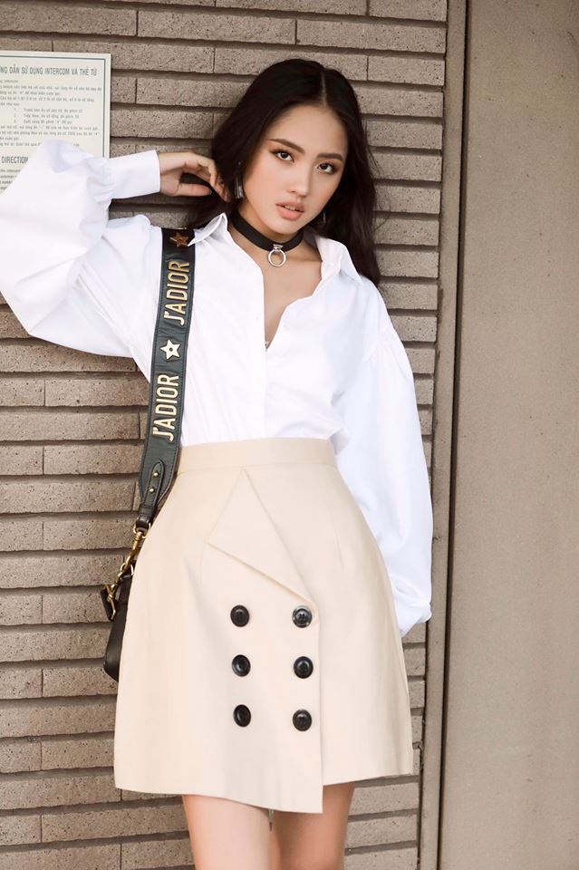 Áo sơ mi trắng với váy chữ A bản to cách tân nổi bật với chiếc túi Dior và vòng cổ choker