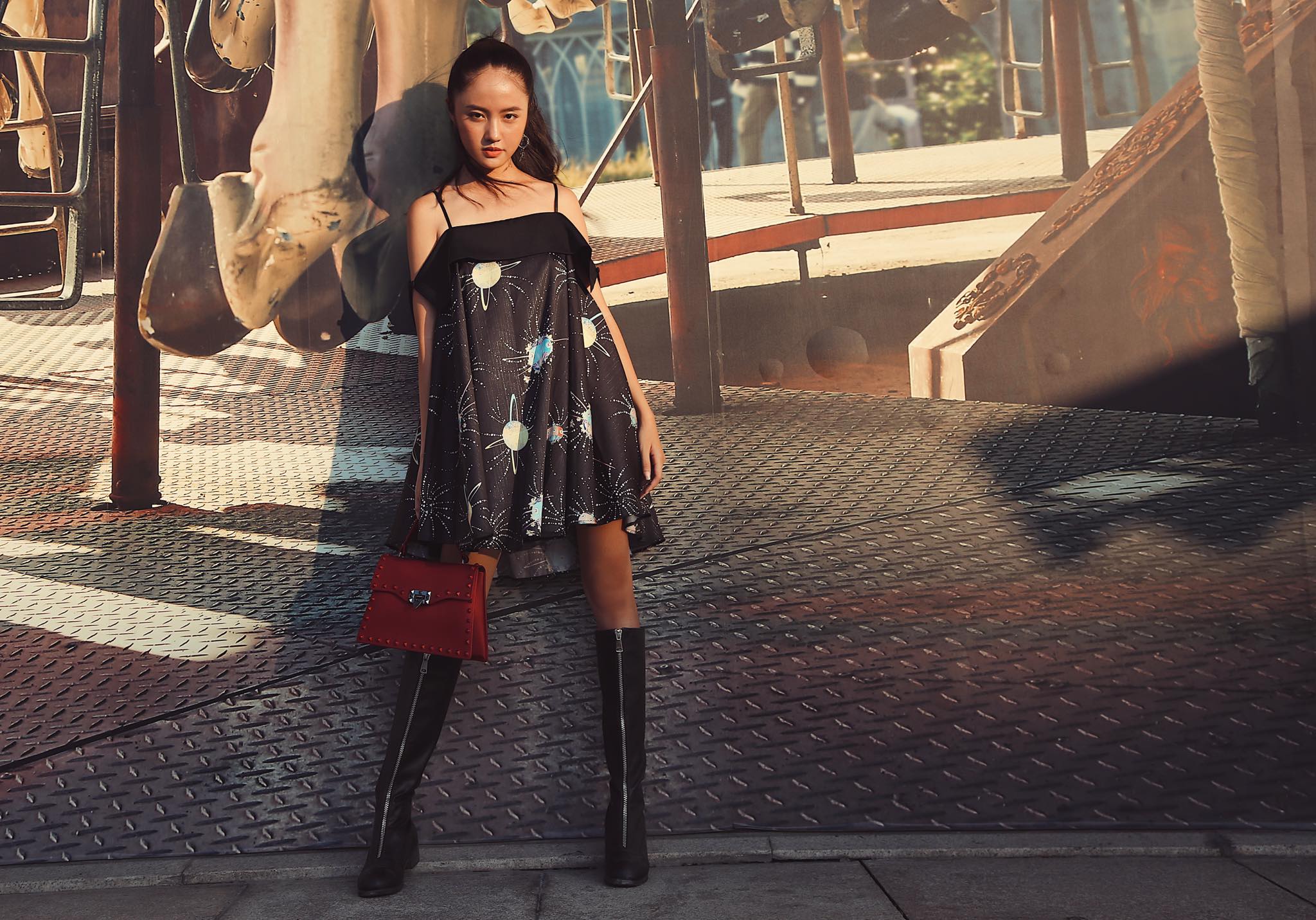 Để tăng thêm phần cá tính cho thiết kế váy hai dây dáng suông, Thanh Vy mix cùng boots hơi hướng chiến binh.
