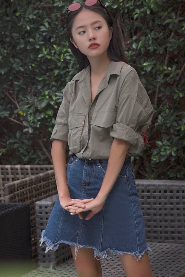 Áo sơ mi oversized kết hợp với váy jeans như nàng mẫu Thanh Vy mặc sẽ là một sự lựa chọn cho các bạn gái trẻ có thể tham khảo trong những dịp đầu thu