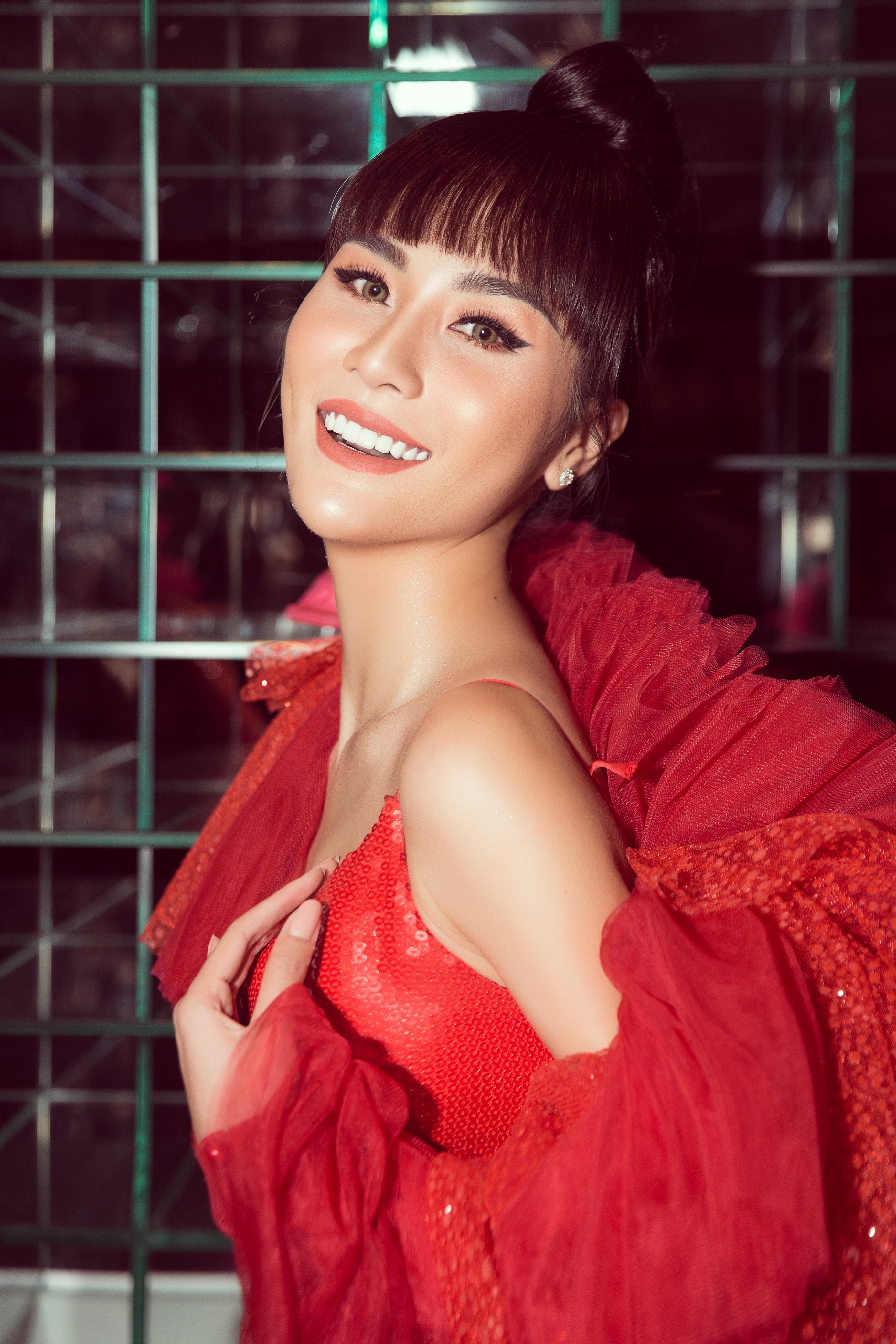 Cô nàng chọn cho mình bộ váy mang tông màu rực rỡ, chất vải sequin lấp lánh tạo nên độ nổi bật khi tham gia sự kiện.
