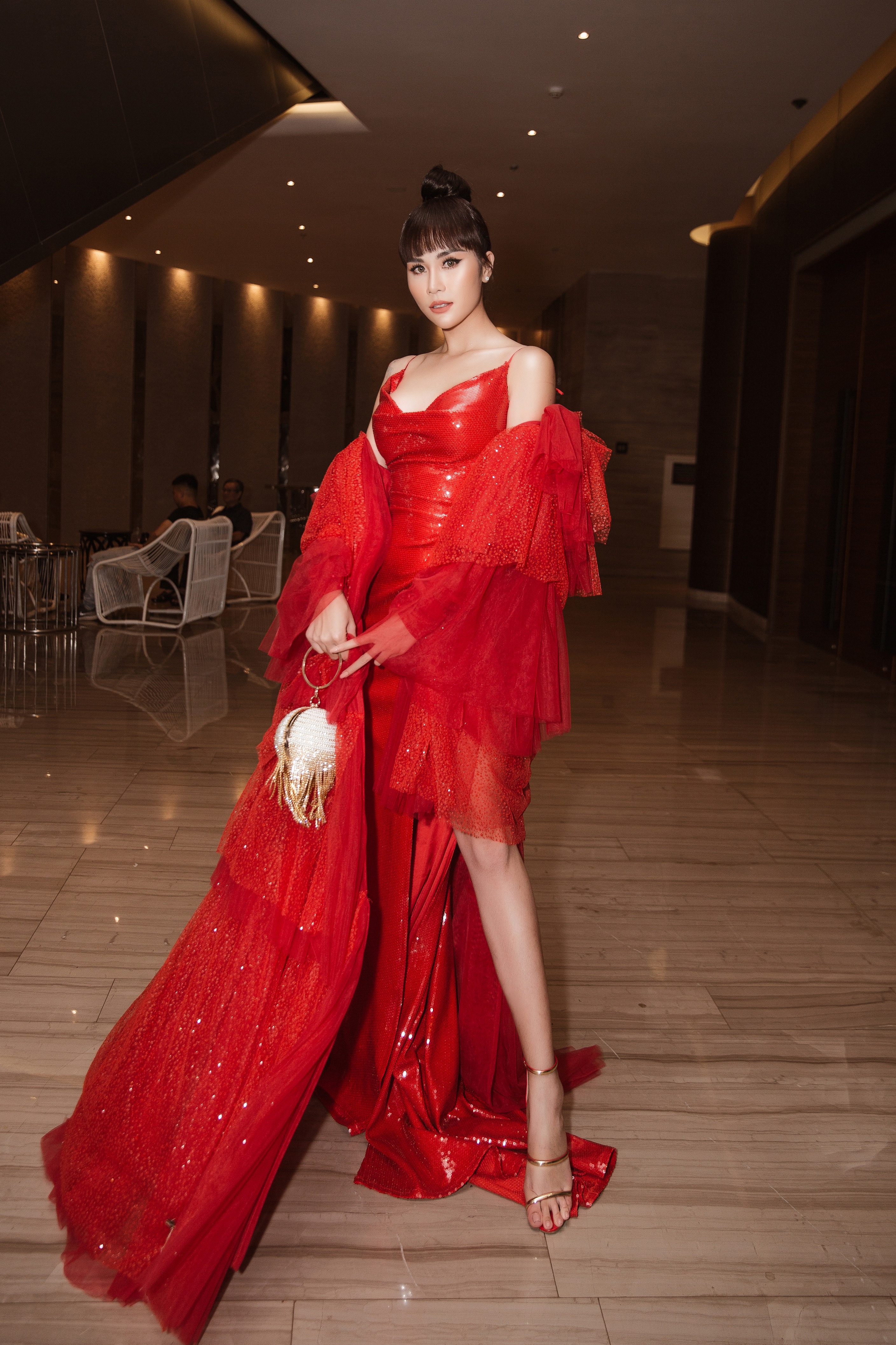Người đẹp còn tinh ý khi chọn cho mình phụ kiện túi tròn cầm tay, đi cùng kiểu tóc bới cao tạo nên tổng thể gợi cảm nhưng vẫn có nét cá tính.