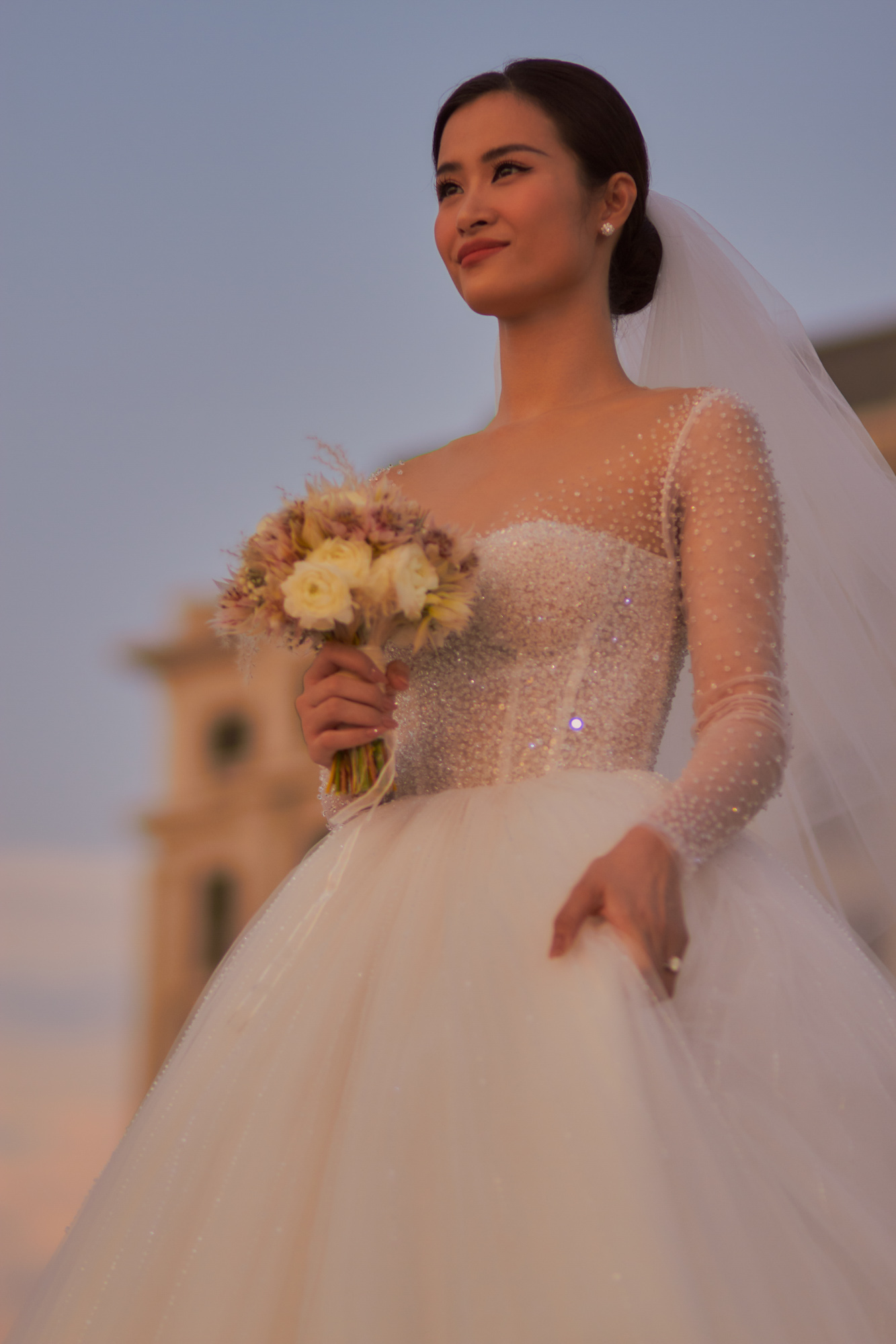 Về chiếc đầm cưới chính, anh chia sẻ đây là bộ cánh mà Đông Nhi vô cùng hài lòng. Thế nên, cô quyết định giữ bí mật đến phút chót để tạo cho Ông Cao Thắng niềm vui bất ngờ, xúc động. Chiếc đầm vedette có váy phồng, tay dài cúp ngực cổ điển, toát lên vẻ sang chảnh tựa công nương. Chưa hết, phom váy chiết eo dựng gọng corset cũng giúp Đông Nhi tôn lên vòng 2 nhỏ nhắn đáng ngưỡng mộ. Nữ ca sĩ mong muốn chiếc váy cưới trong mơ sẽ nhẹ nhàng, mong manh và trong trẻo nhất có thể.