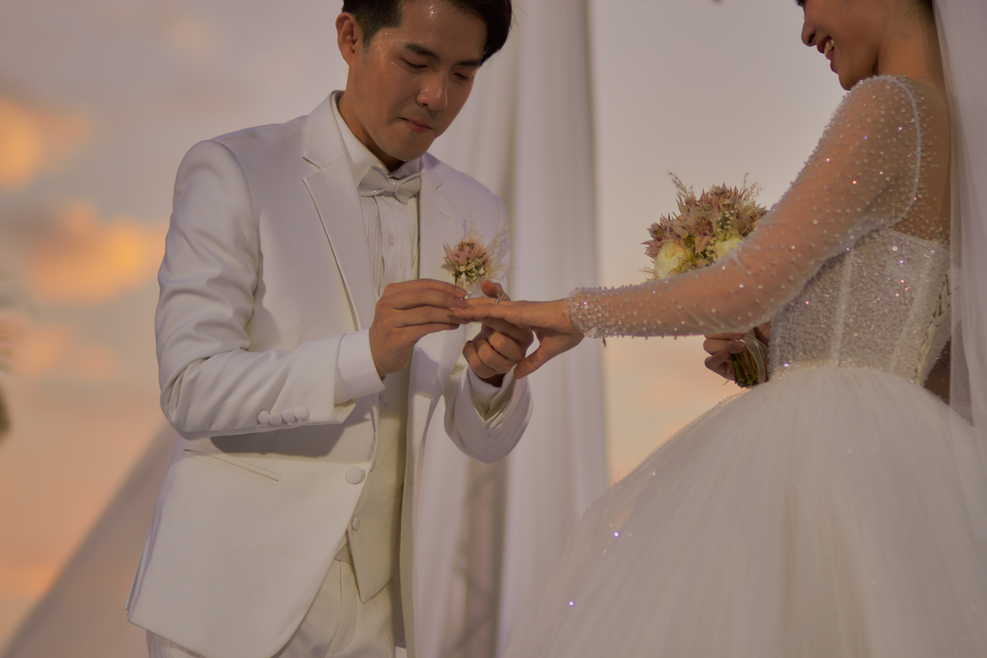 Bên cạnh đó, bộ suit của Ông Cao Thắng cũng được cắt may bằng vải nhập từ Ý và làm hoàn toàn thủ công, nhờ đó khiến thiết kế càng thêm đắt giá và xa hoa bội phần. Chú rể diện suit màu xám, kem và màu trắng cho tiệc chính.
