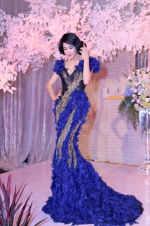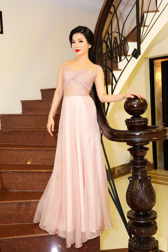 Kể từ khi kết hôn và sinh con, Lệ Quyên đã lột xác hoàn toàn thành một quý cô mặn mà, đằm thắm và có gout thẩm mỹ cao. Cô là một trong những khách hàng khá thân thiết với NTK Hoàng Hải. Trong hình, ca sĩ diện chiếc váy màu hồng bằng chất lụa oganza nhập từ Ý kiểu cắt đơn giản tinh tế ở những nếp gấp uốn lượn một cách kỹ thuật cao để tạo phom dáng sang trọng của “Ông trùm đầm xuyên thấu”.
