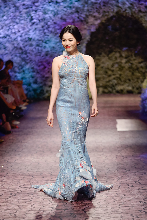Cũng với gam xanh bầu trời nhã nhặn nhưng thiết kế trên hình được phối ăn ý giữa voan lưới mỏng và họa tiết hoa 3D. Giọng ca 44 tuổi khéo chọn kiểu tóc suông. Trong các show diễn, nữ ca sĩ thường xuất hiện trẻ trung và cuốn hút trong thiết kế voan mỏng, họa tiết xanh pastel dịu mắt.