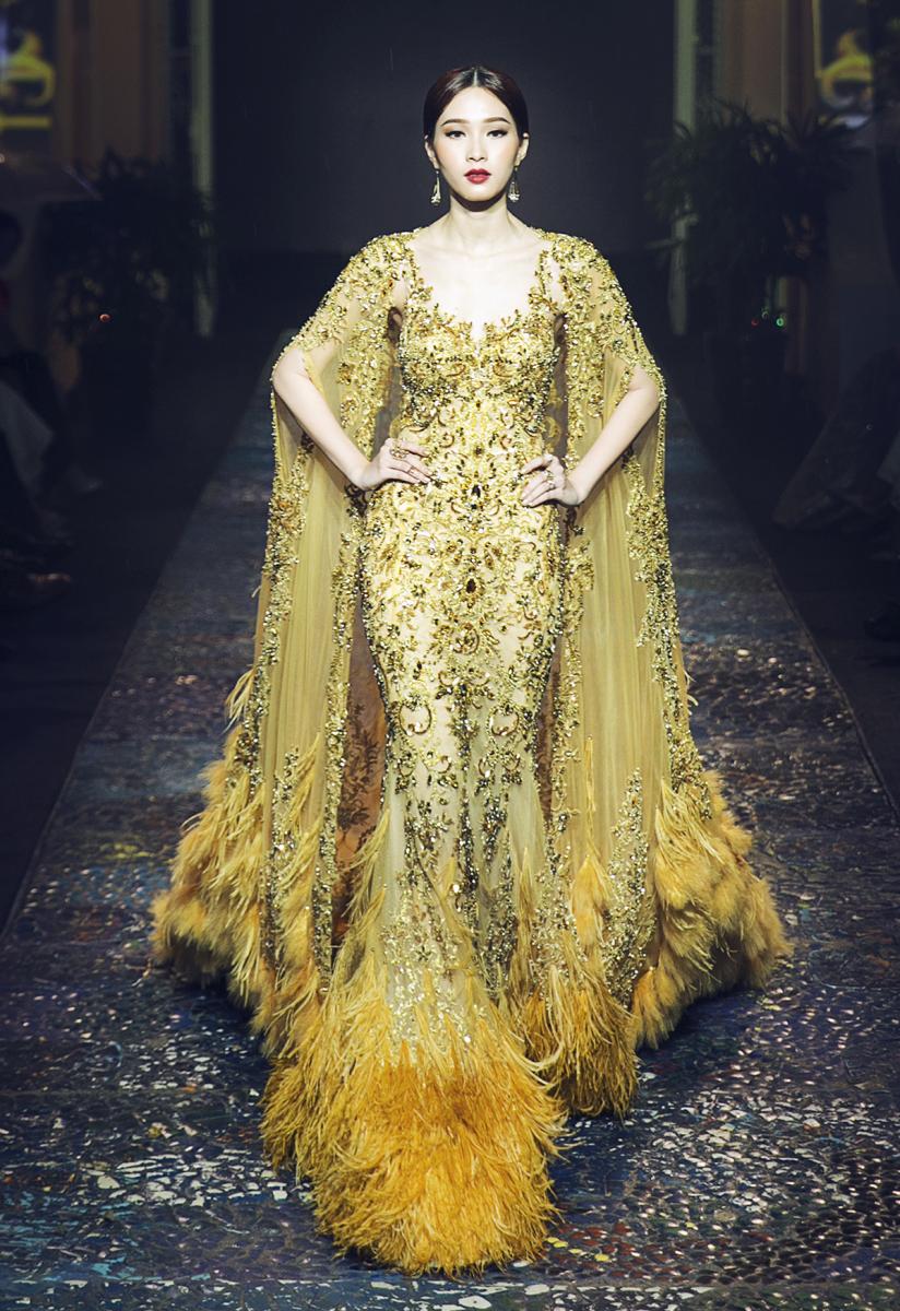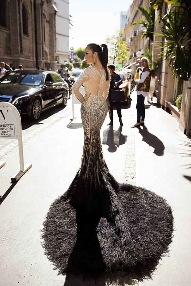 Bộ cánh hình quả chuông được đính kết lông vũ trên nền lưới organza giúp cựu Đại sứ Du lịch tỏa sáng trên thảm đỏ danh giá nhất hành tinh- Cannes. Tông màu vàng ánh kim, kết hợp với những viên pha lê lấp lánh hòa quyện với sự kiêu sa của lông vũ mang lại sự nhẹ nhàng cuốn hút cho nữ doanh nhân.